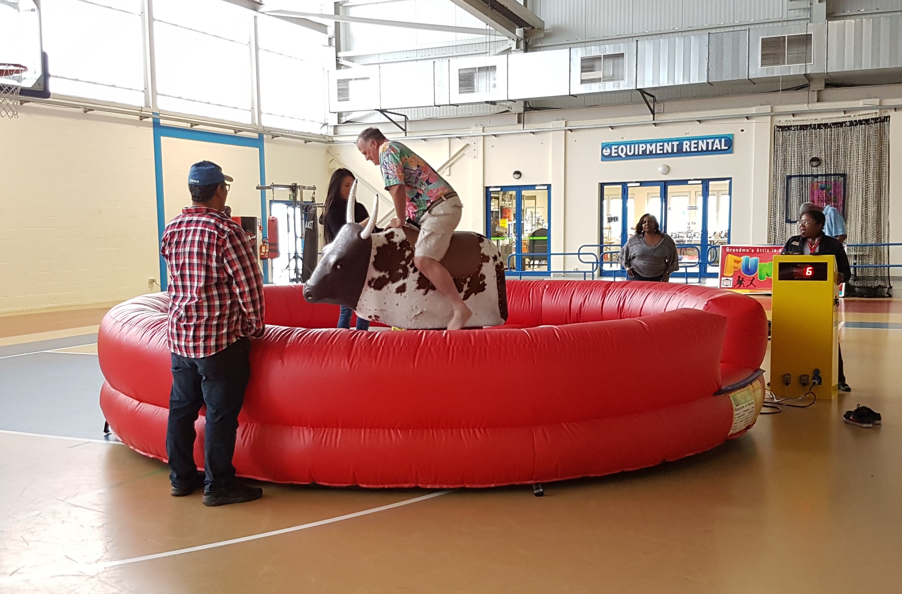John Phelan, a transportation office employee, tries the mechanical bull at the garrison Organization Day Sept. 22, 2017, on Chièvres Air Base, Belgium. Employees and garrison leaders gathered at the Family and Morale, Welfare and Recreation's...