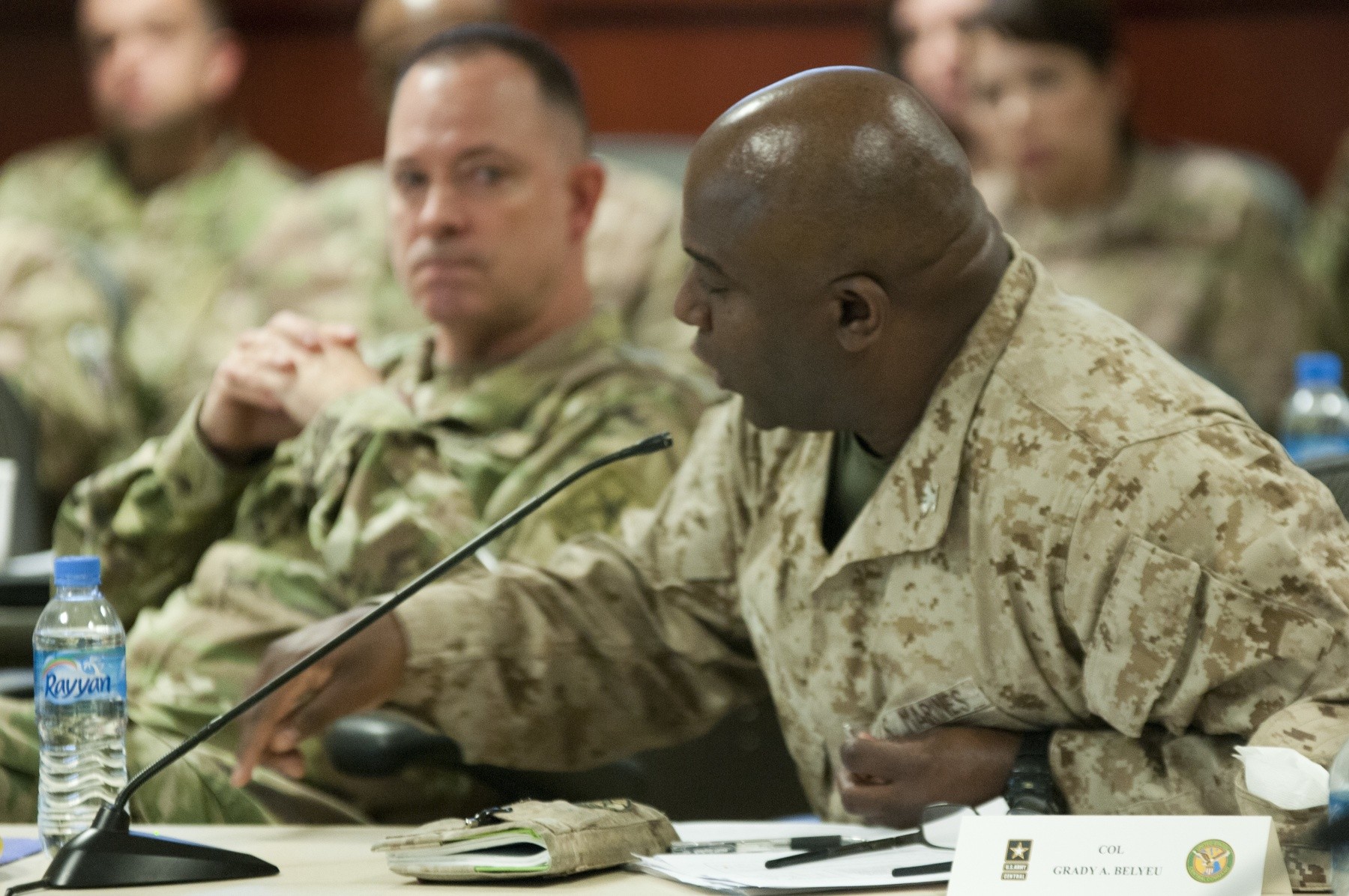 U.S. Marine Corps Col. Grady Belyeu, Marine Corps Forces Central Command senior budget analyst, emphasizes a point during a panel session at the 2017 Financial Management and Comptroller Forum, Dec. 5, 2017 in Qatar. (U.S. Army photo by Spc. Joseph B...