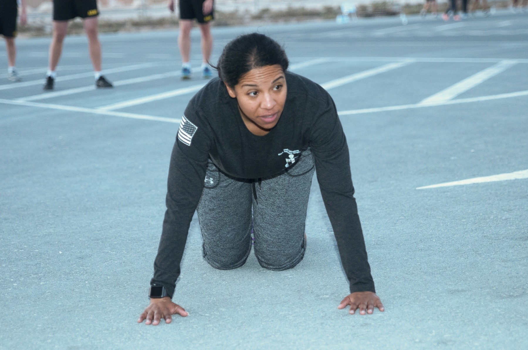 Staff Sgt. Pamela Thomas prepares to complete a pushup event during a team-building fitness competition as part of the Financial Management and Comptroller Forum Dec. 6, 2017 in Qatar. The competition included physical challenges like buddy carries, ...