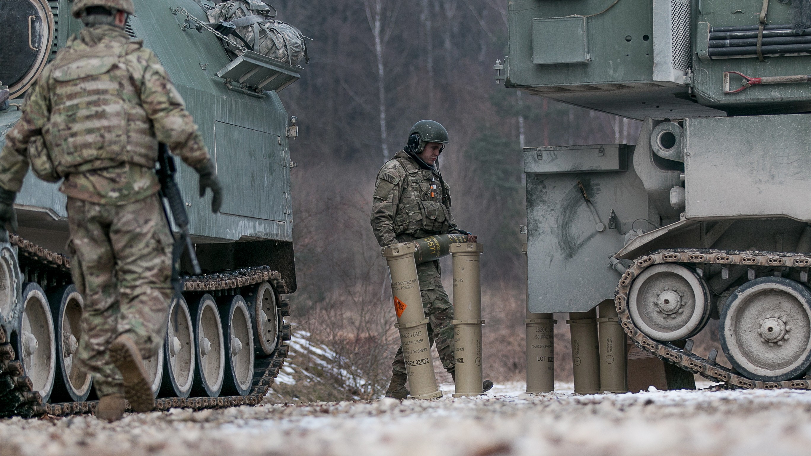 Soldiers from 1st Battalion, 7th Field Artillery Regiment, 2nd Armored Brigade Combat Team, 1st Infantry Division, Fort Riley, Kansas, turn in expended canisters to an ammunition vehicle during Dynamic Resolve 18, at Grafenwoehr Training Area in Germ...
