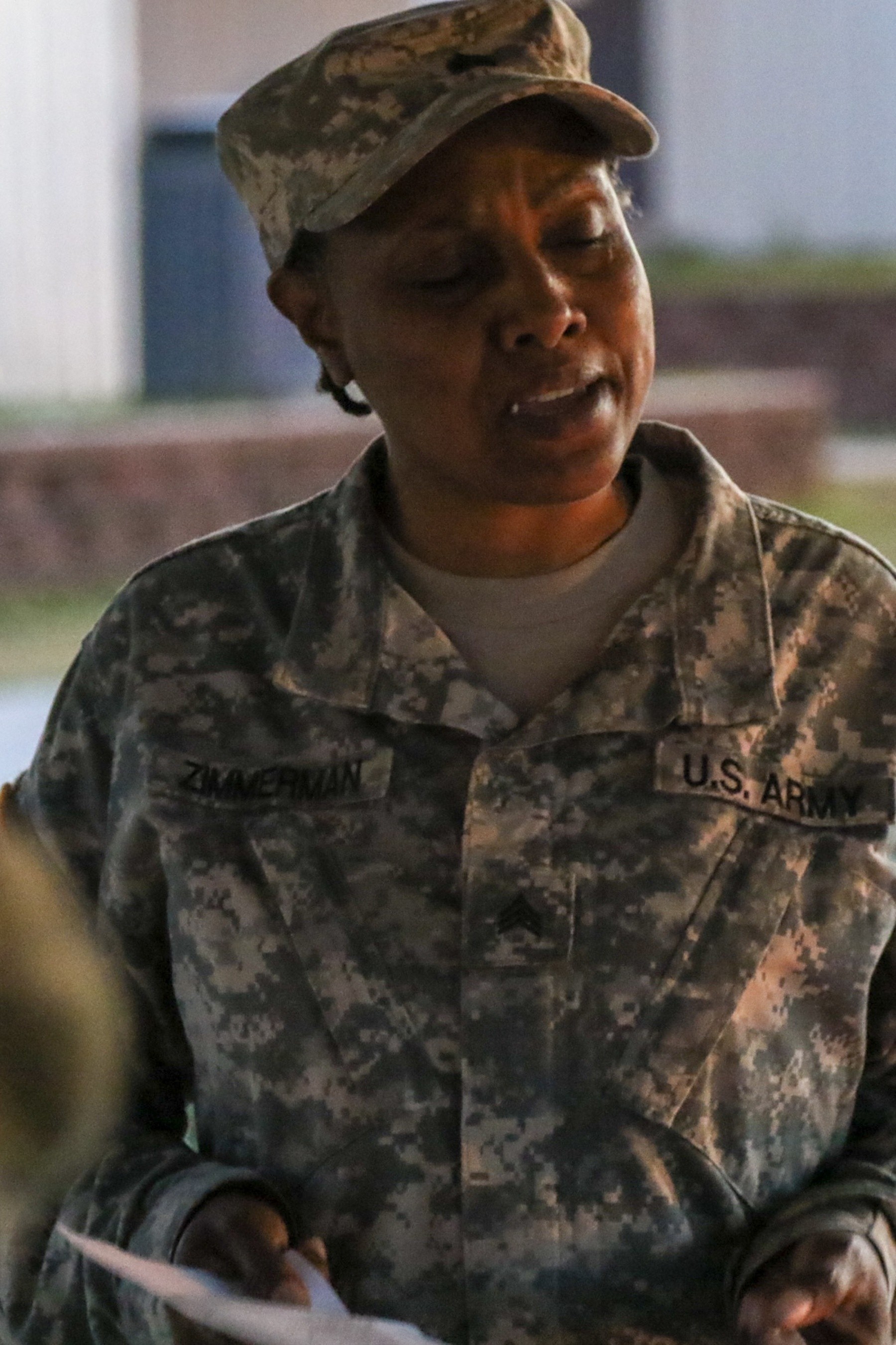 Fort Polk, La., May 6, 2018 - Georgia Army National Guardsman, Sgt, Sheila P. Zimmerman, equipment and parts noncommissioned officer, 1160th Transportation Company, Rome, Ga., leads the group in song during religious services. Religious services ar...