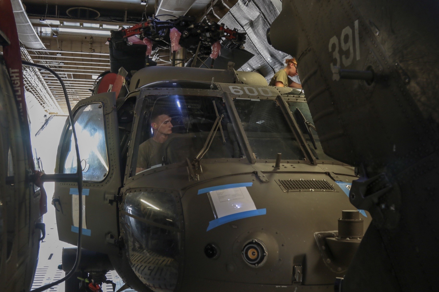 A Georgia Army National Guard helicopter maintenance and support crew from the Marietta based 171st General Support Aviation Battalion, perform safety checks while loading a UH-60 Black Hawk on an U.S. Air Force Reserve C-5M Super Galaxy on July 24, ...