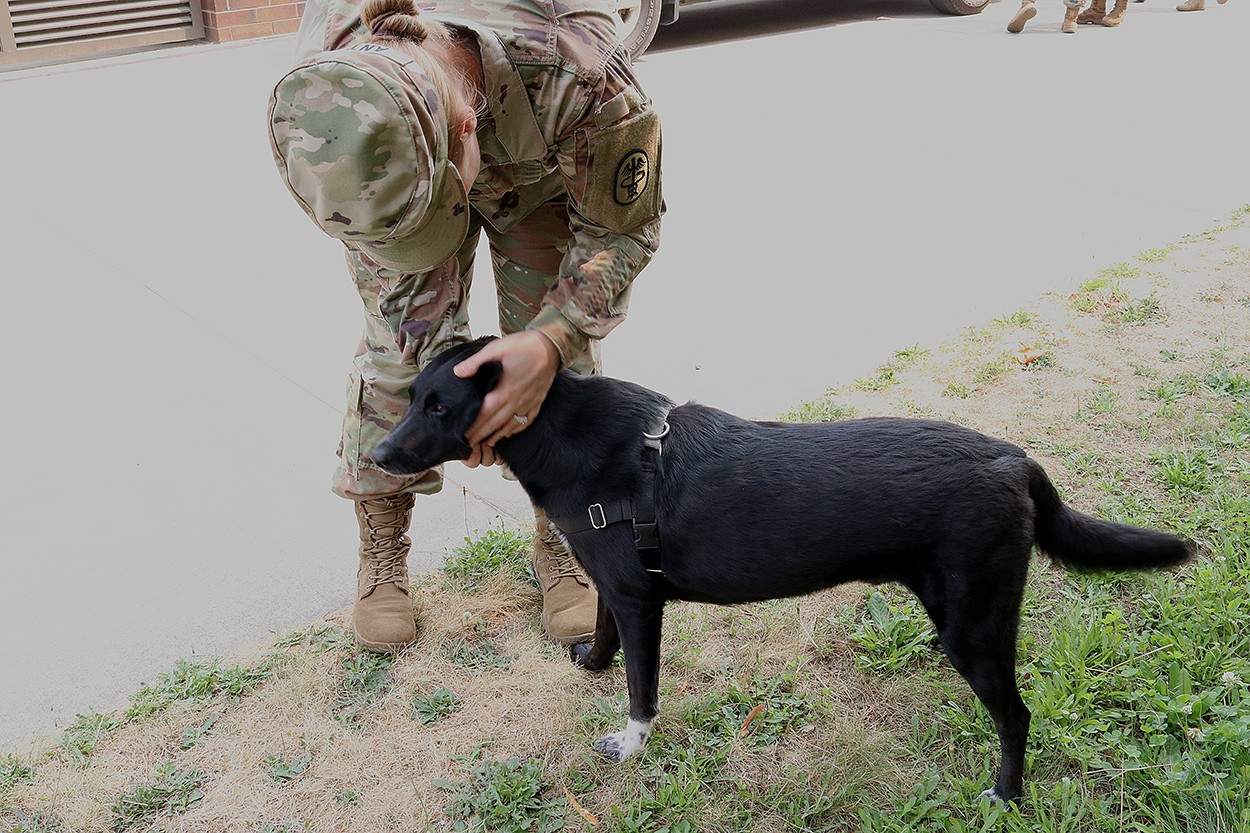 Shadow, Master Sgt. Phillip Preyer's very friendly dog, gets a pet from one of the Soldiers he kept company while the crew of Soldiers from Madigan Army Medical Center, Joint Base Lewis-McChord, Wash., built a tiny home for a local veteran as a volun...