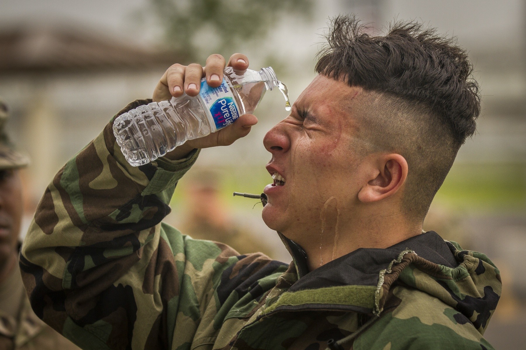 A Soldier assigned to Company B, 602nd Aviation Support Battalion, 2nd Combat Aviation Brigade, 2nd Infantry Division, rinses his skin after exposure to chlorobenzylidene malononitrile gas during chemical, biological, radiological and nuclear defense...
