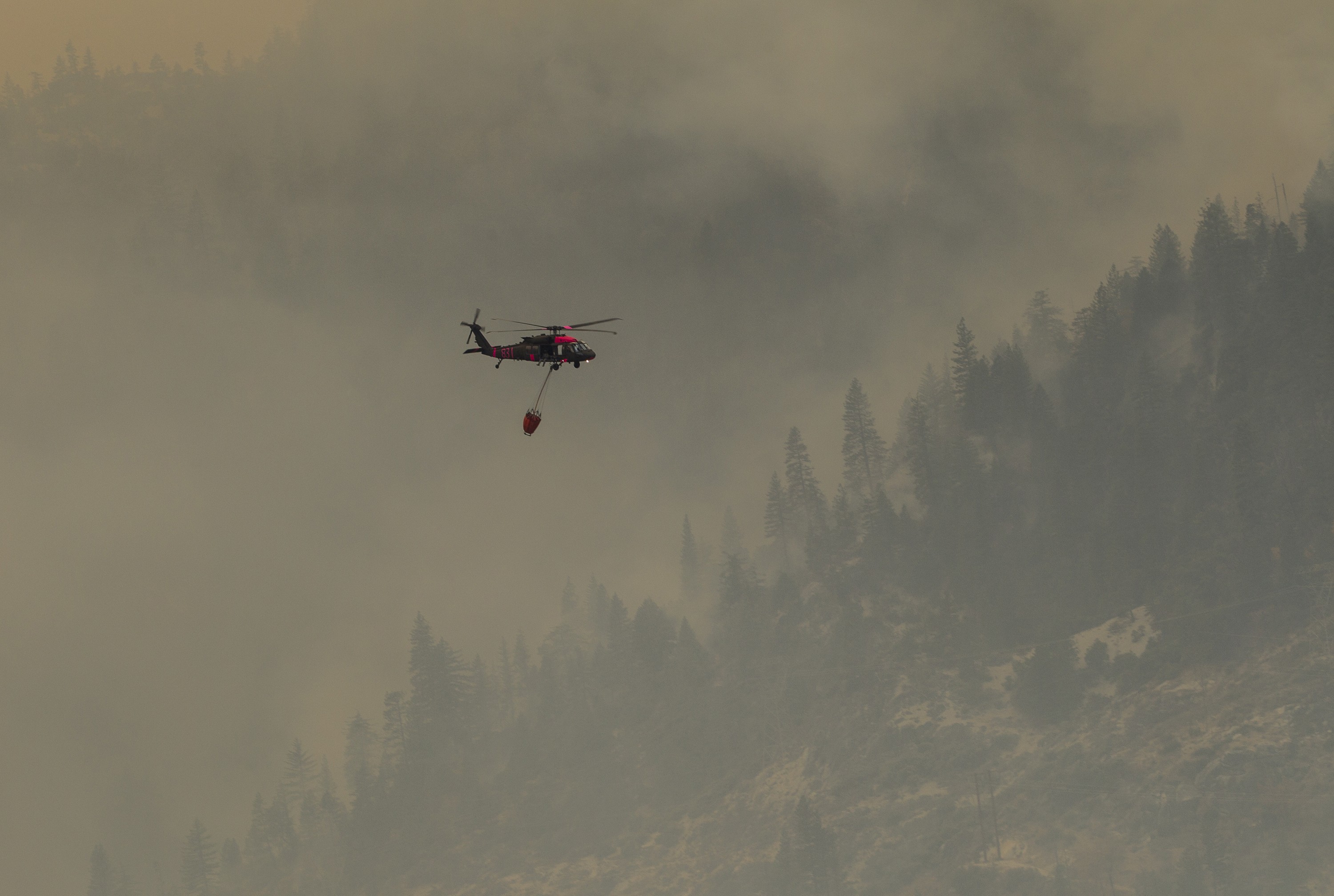 An older A+ model UH-60 and a CH-47 Chinook, from Cal Guard flight facilities in Fresno and Stockton, respectively, also flew water bucket missions over the fire, boosting the overall total to 192,206 gallons of water dropped by the four Cal Guard helicopters activated for the fire. The heavy-lift Chinook, which had fewer drops, released the largest single sum of water between the assets, thanks largely to its 2,000-gallon bucket.