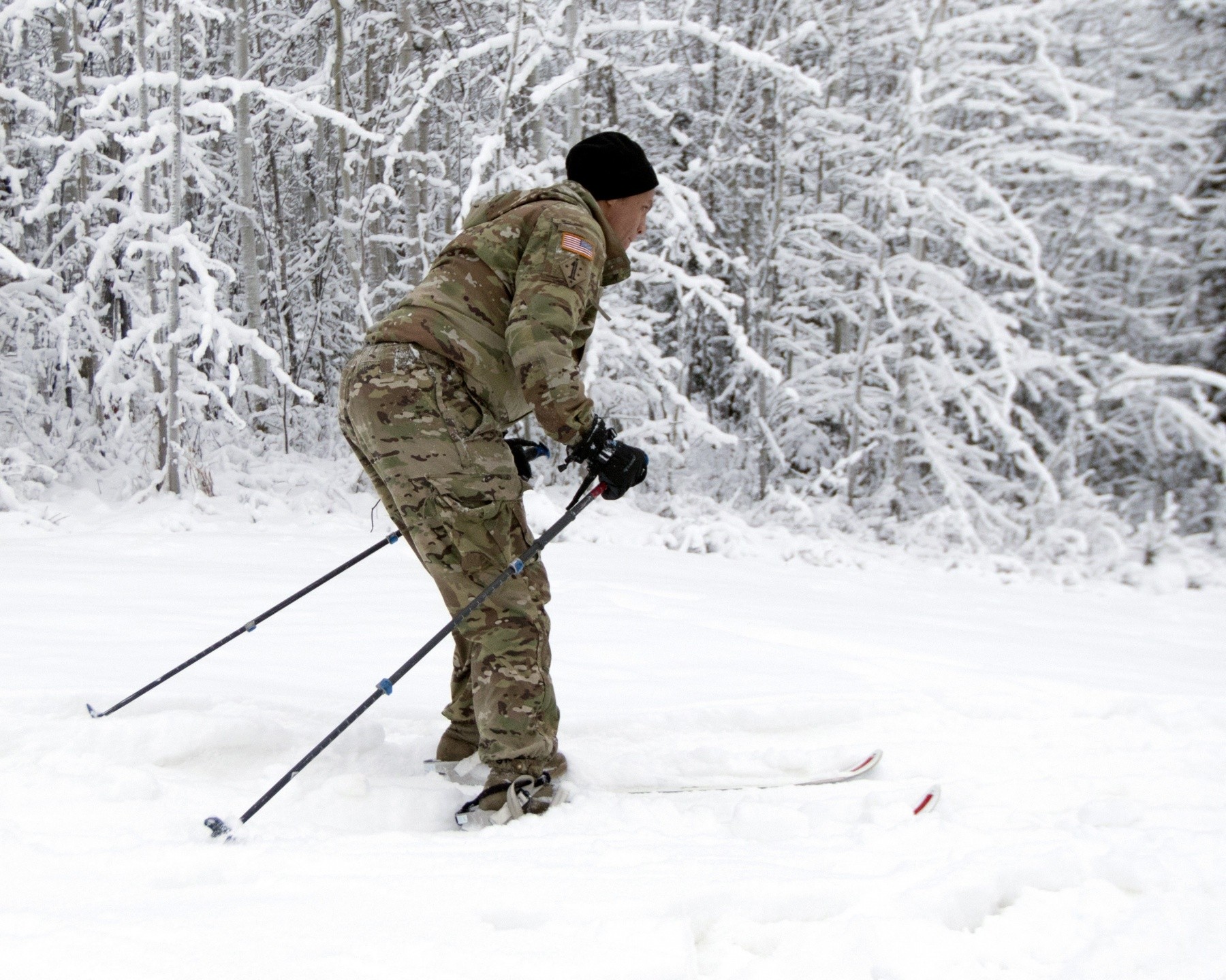 Spc. Xavier Kearse, a Fort Wainwright Soldier assigned to 1st Battalion, 5th Infantry Regiment, conducts cross-country skiing Dec. 11 in preparation for the upcoming U.S. Army Alaska Winter Games. The skiing also provides an added physical training v...