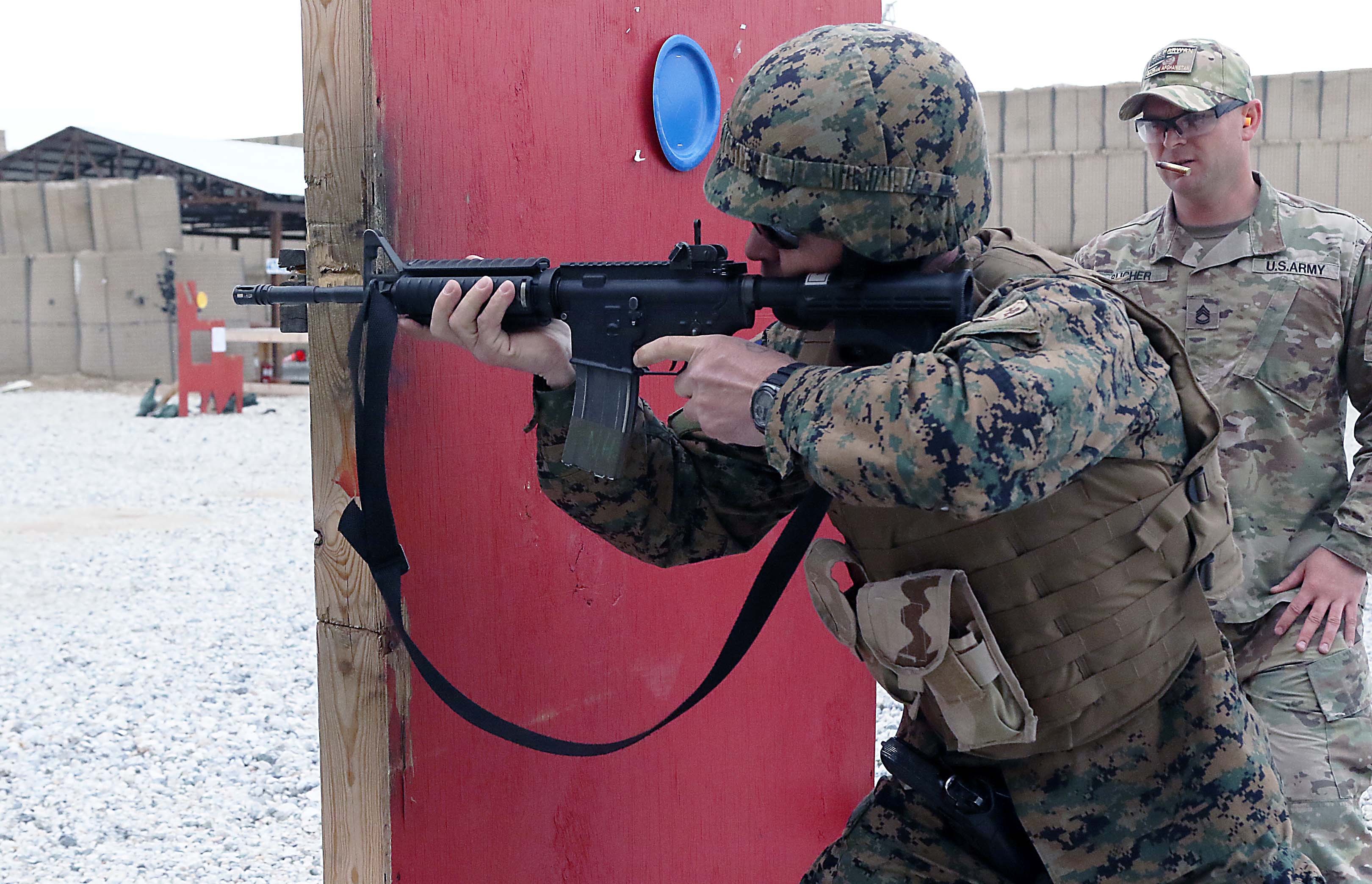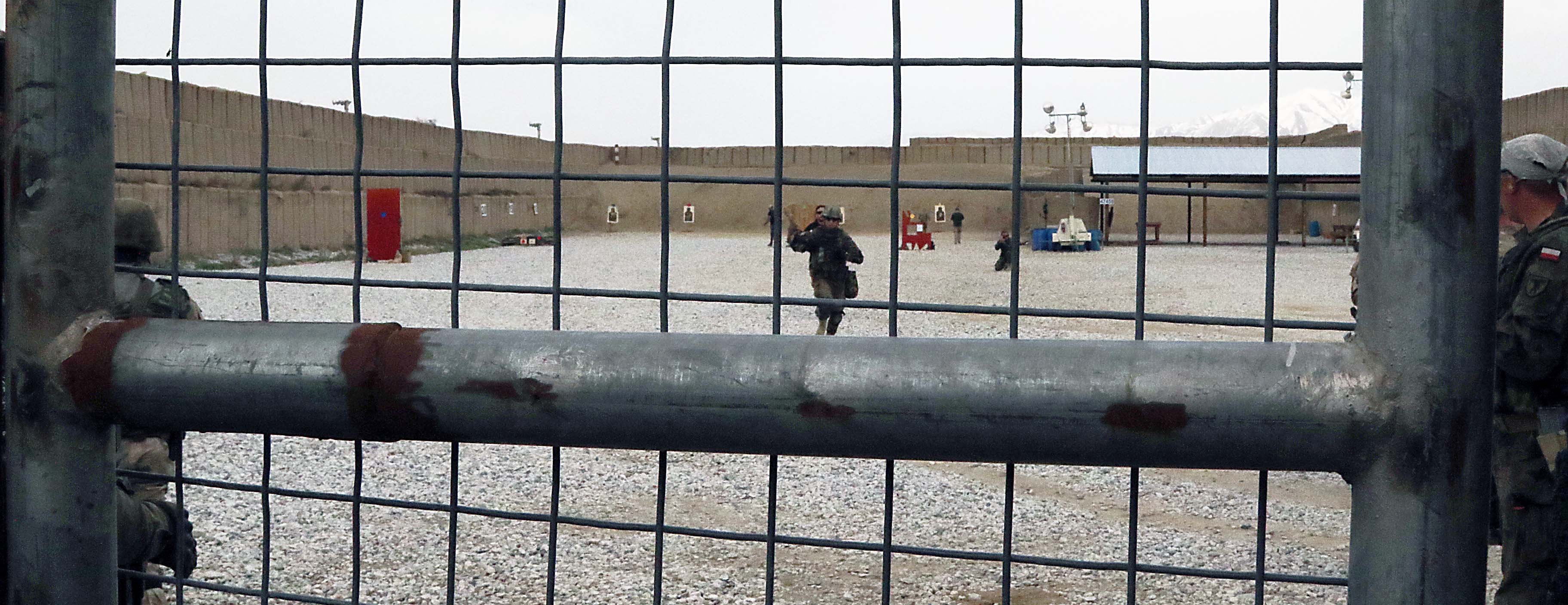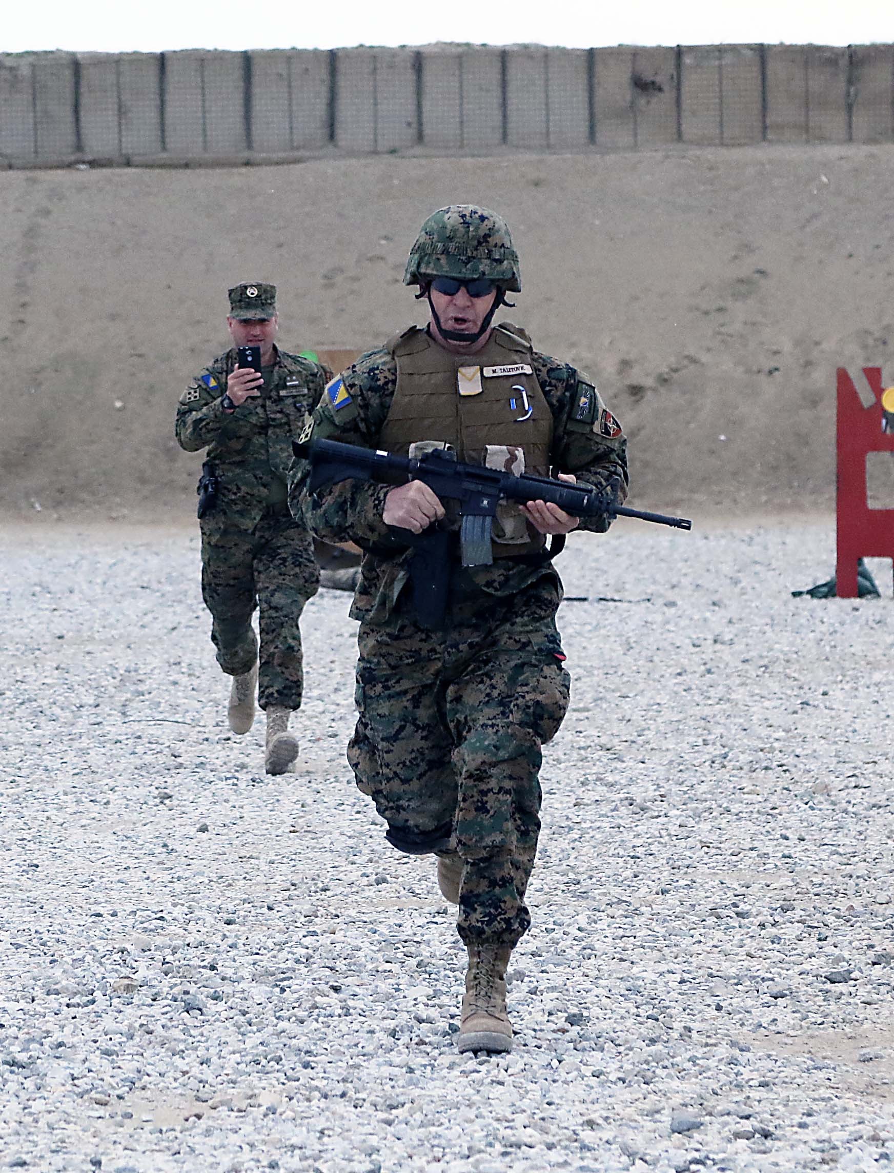 Sgt. Mirsad Taletovic, Bosnia and Herzegovina Contingent, U.S. Forces -- Afghanistan, fires as Army Sgt. 1st Class Jeremy Bugher, range safety, Joint Task Force Parwan, U.S. Forces -- Afghanistan, observes during the Combat Skills Challenge March 30...