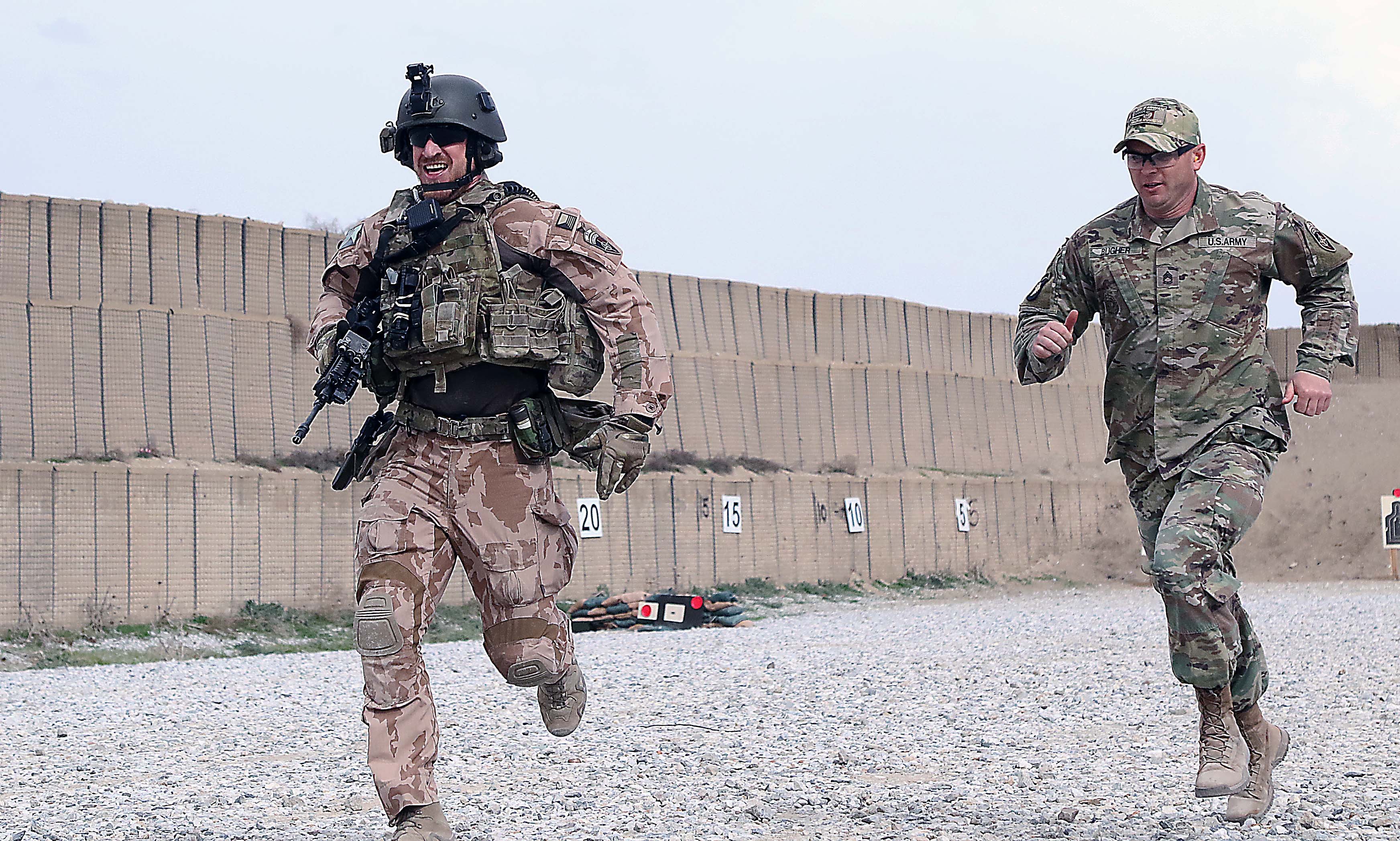 A Czech Republic soldier, Task Force Lion, runs to the end point to complete his portion of the Combat Skills Challenge as Sgt. 1st Class Jeremy Bugher, range safety, Joint Task Force Parwan, stays in stride March 30 at Maholic Range, Bagram Airfield...