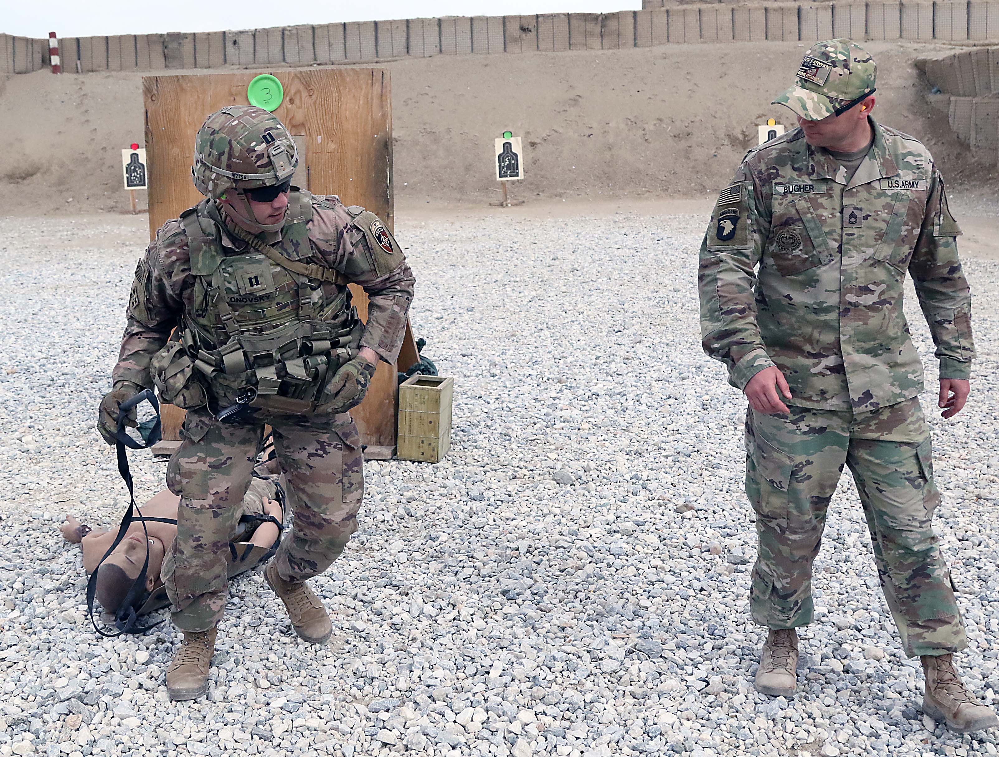 Capt. William Konovsky, Task Force White Eagle, Illinois Army National Guard, drags a weighted human dummy to the next station during the Combat Skills Challenge March 30 at Maholic Range, Bagram Airfield, Afghanistan. Sgt. 1st Class Jeremy Bugher, r...