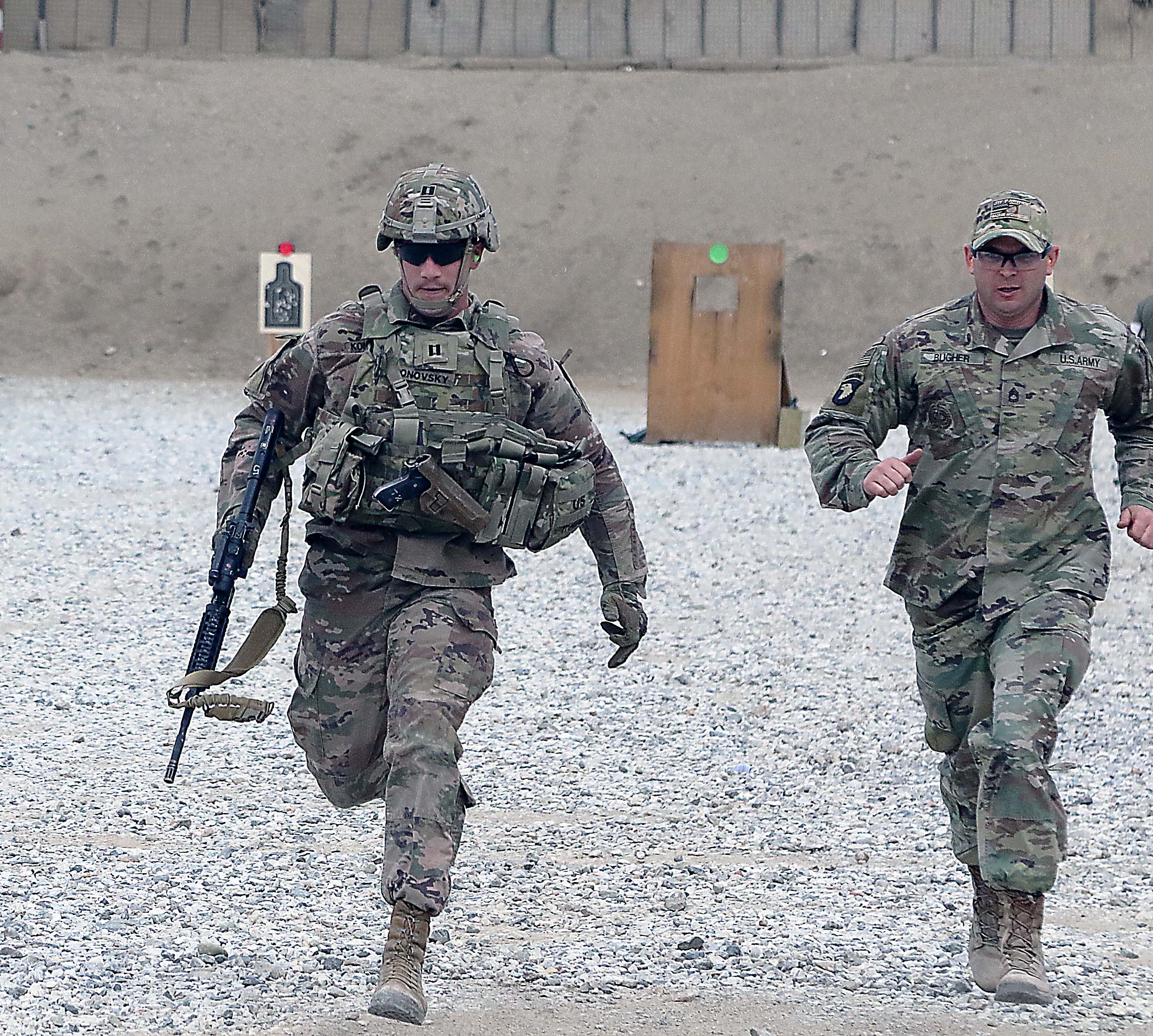 Capt. William Konovsky, Task Force White Eagle, Illinois Army National Guard and Sgt. 1st Class Jeremy Bugher, range safety, Joint Task Force Parwan, U.S. Forces -- Afghanistan, run down to the end point to complete Konovsky's portion of the Combat S...