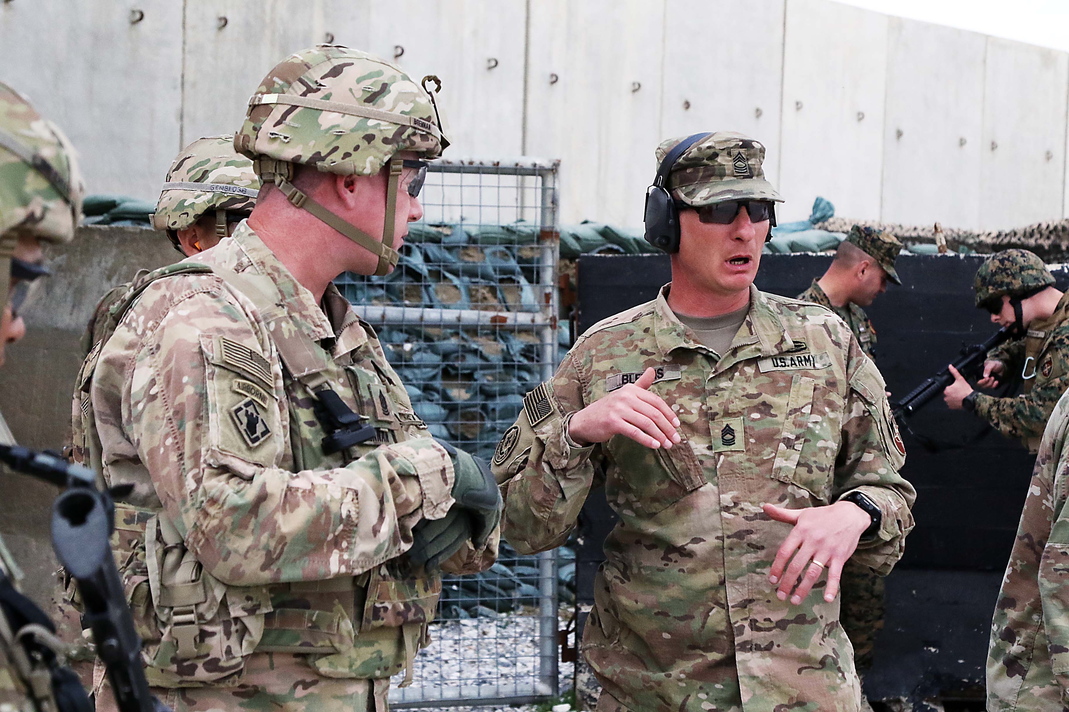 Master Sgt. Nicholas Blevins, range officer in charge, Joint Task Force Parwan, U.S. Forces -- Afghanistan, briefs Army Command Sgt. Maj. John Brennan, 20th Engineer Brigade, during the Combat Skills Challenge March 30 at Maholic Range, Bagram Airfi...