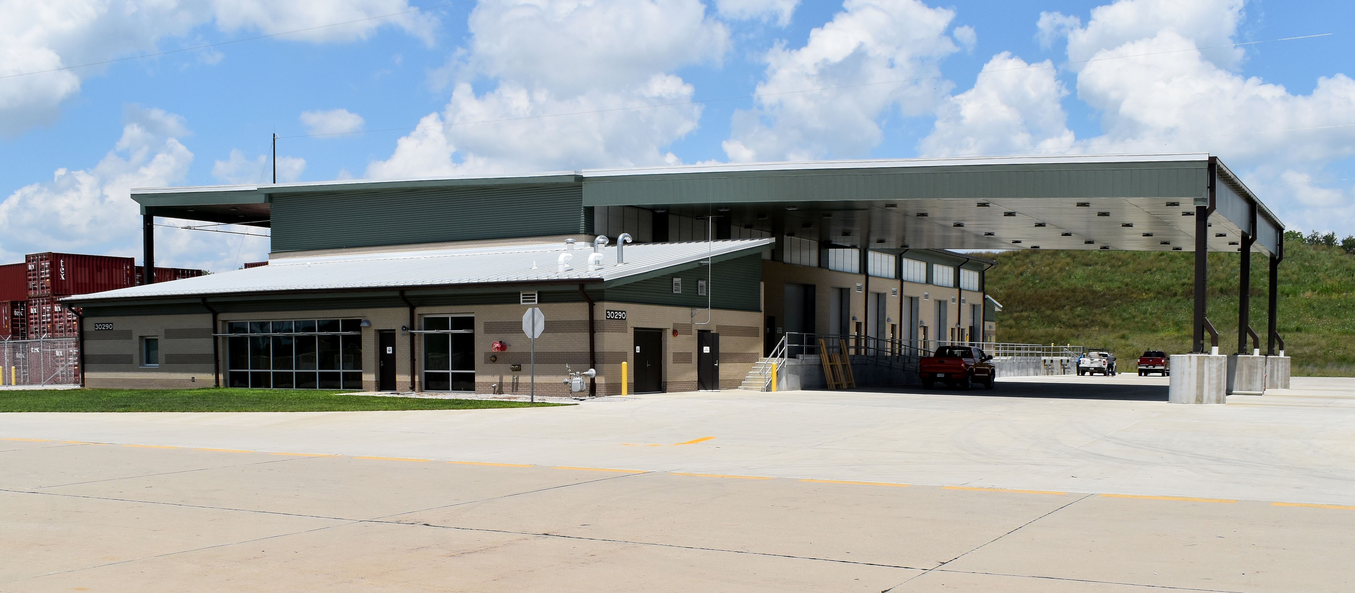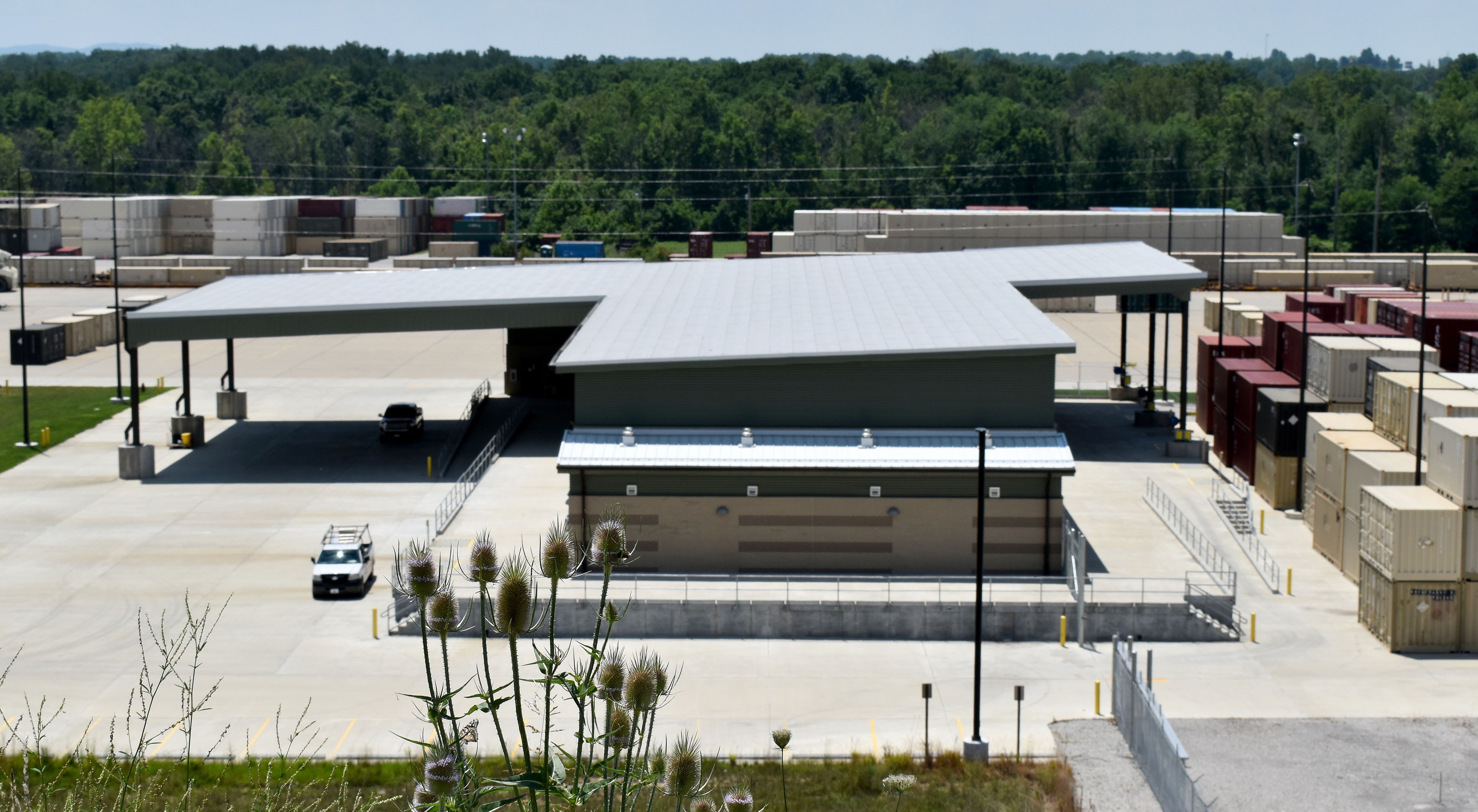 Additional benefits include: secure and efficient storage for a full range of munitions; maximized operations during inclement weather; reduced need for separate operations at widely-disbursed warehouses and loading pads; improved quality work environment for employees; 13,000 square feet of storage and shipping area with five blast-proof staging bays and one shop bay; a 4,000 square foot admin area and trucker lounge; and 100,000 square feet of concrete hardstand with truck scale.