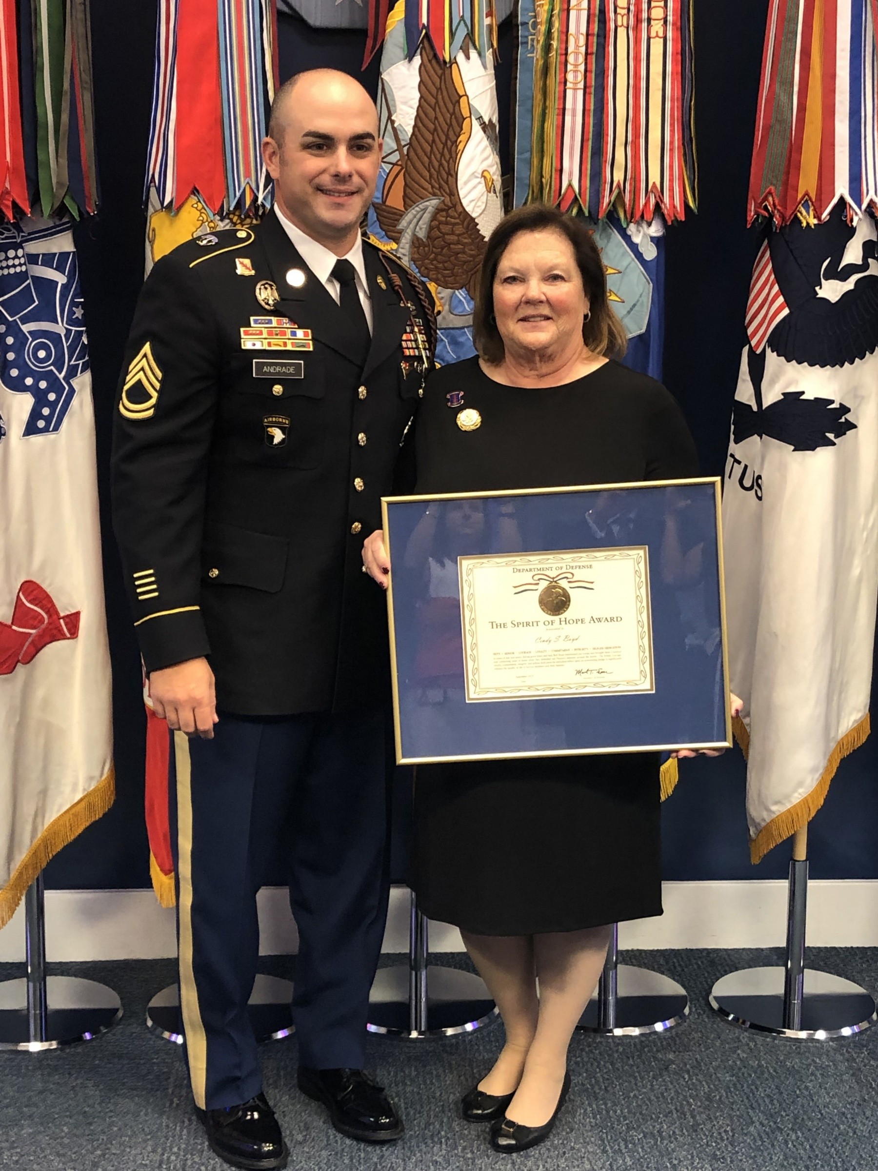 Cindy Boyd, president of Precision Contracting Services Inc. in Florida, received the Spirit of Hope award September 28, 2019 for the work she has done for the Army community.