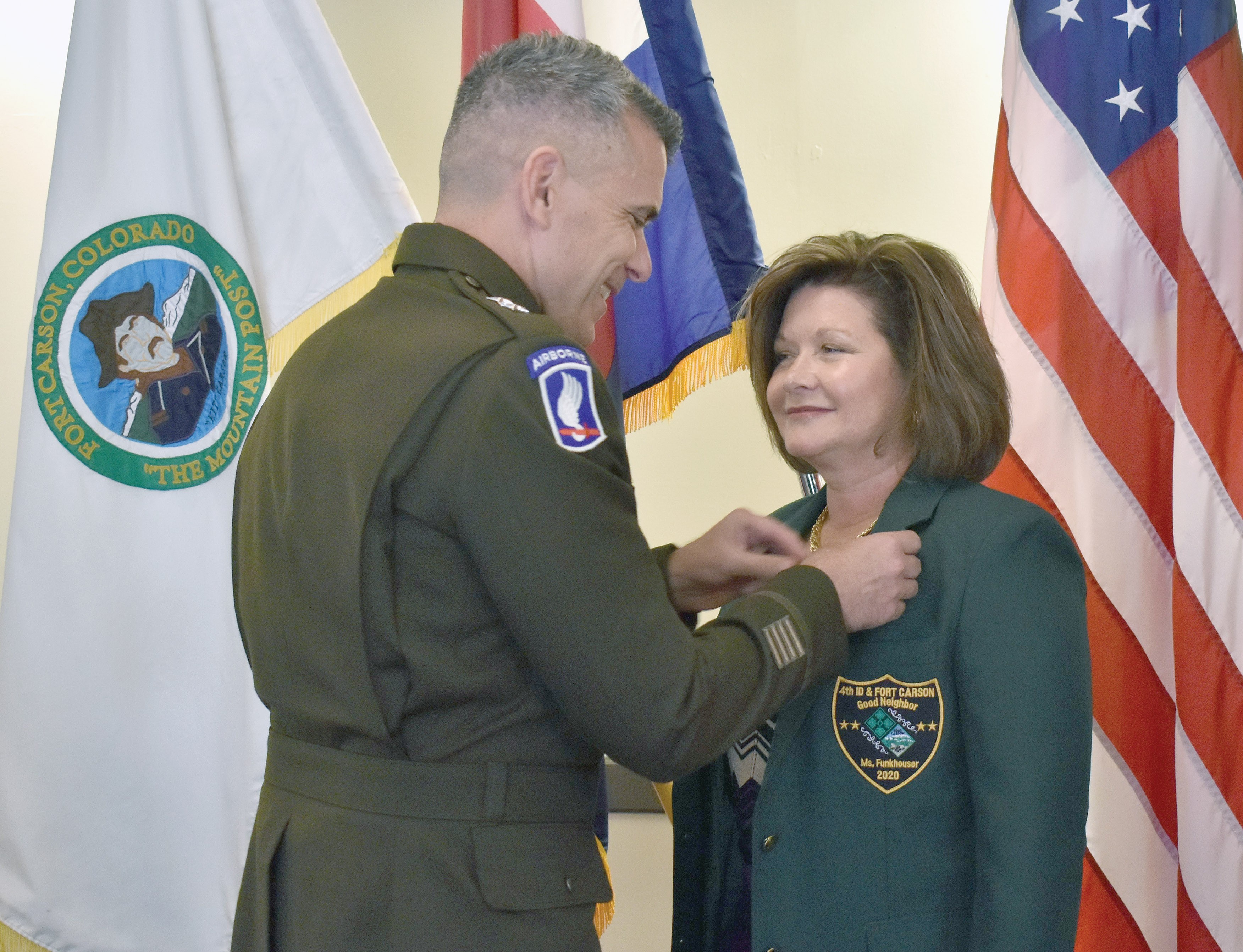 Maj. Gen. Matthew W. McFarlane, commanding general, 4th Infantry Division and Fort Carson, hosted a luncheon award ceremony inducting Deanne Funkhouser, as the newest member of the Fort Carson Good Neighbor Program. Funkhouser, the Mountain Post’s 44th Good Neighbor, received the award in front of family, friends and colleagues.