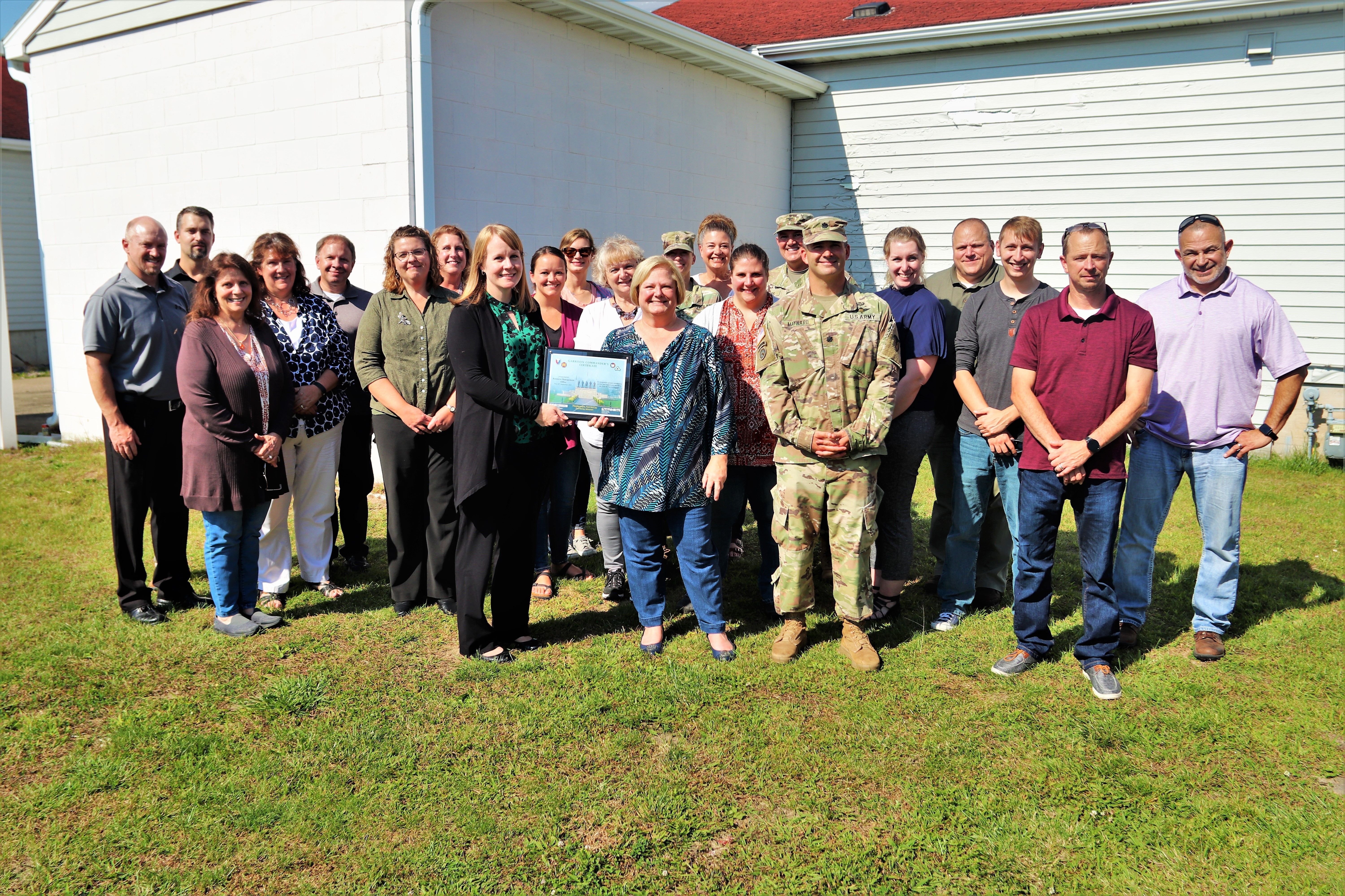 Members of the Fort McCoy Resource Management Office (RMO) and the Fort McCoy Garrison command team (Garrison Commander Col. Michael Poss, Deputy Garrison Commander Lt. Col. Chad Maynard, and Command Sgt. Maj. Raquel DiDomenico) stop for a photo Sept. 30, 2021, as RMO team members are recognized for excellence with a Garrison Command Team Certificate of Excellence at Fort McCoy, Wis.