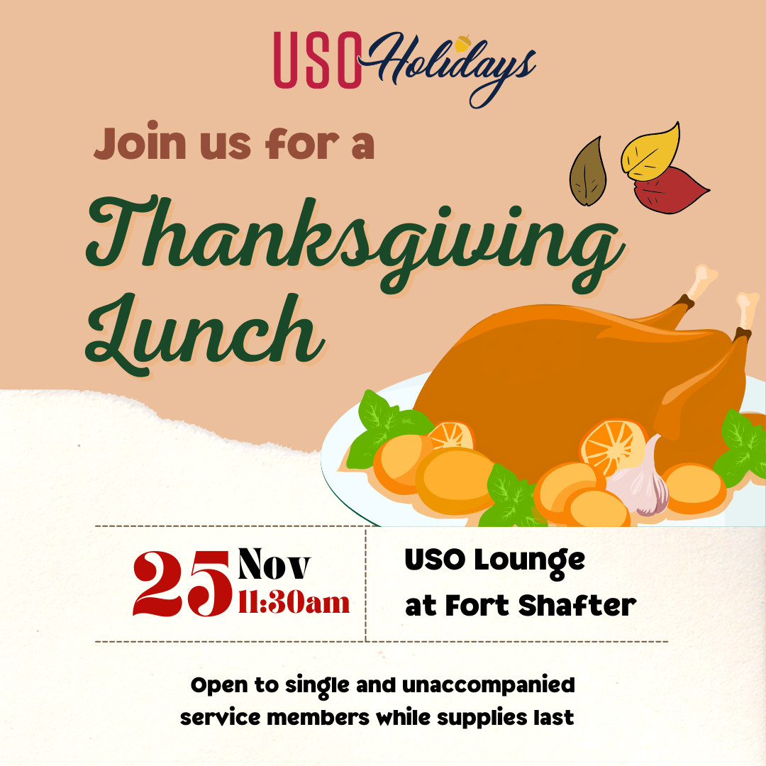 The Fort Shafter USO holiday meal starts at 11:30 a.m. A flyer is available at https://home.army.mil/hawaii/index.php/download_file/4493/0.