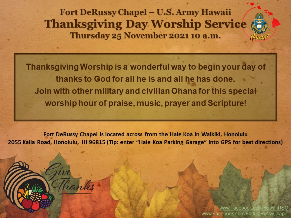 The Religious Support Office will host a Thanksgiving Day worship service at the Fort DeRussy Chapel Thursday, Nov. 25 at 10 a.m. A flyer is available at https://home.army.mil/hawaii/index.php/download_file/4494/0.