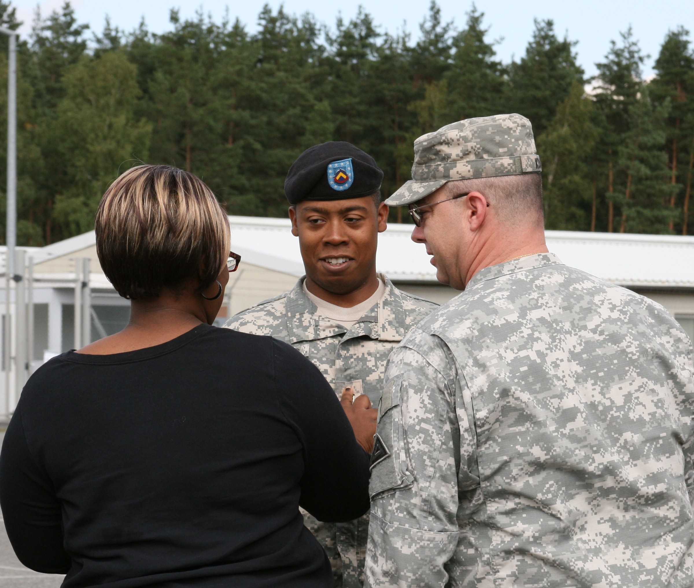 SGT Luis D. Quinones, an Information Technology technician at the Joint Multinational Simulation Center (JMSC) in Grafenwoehr, Germany, receives his promotion to sergeant during a ceremony at the JMSC last week with the assistance of his wife, Donett...