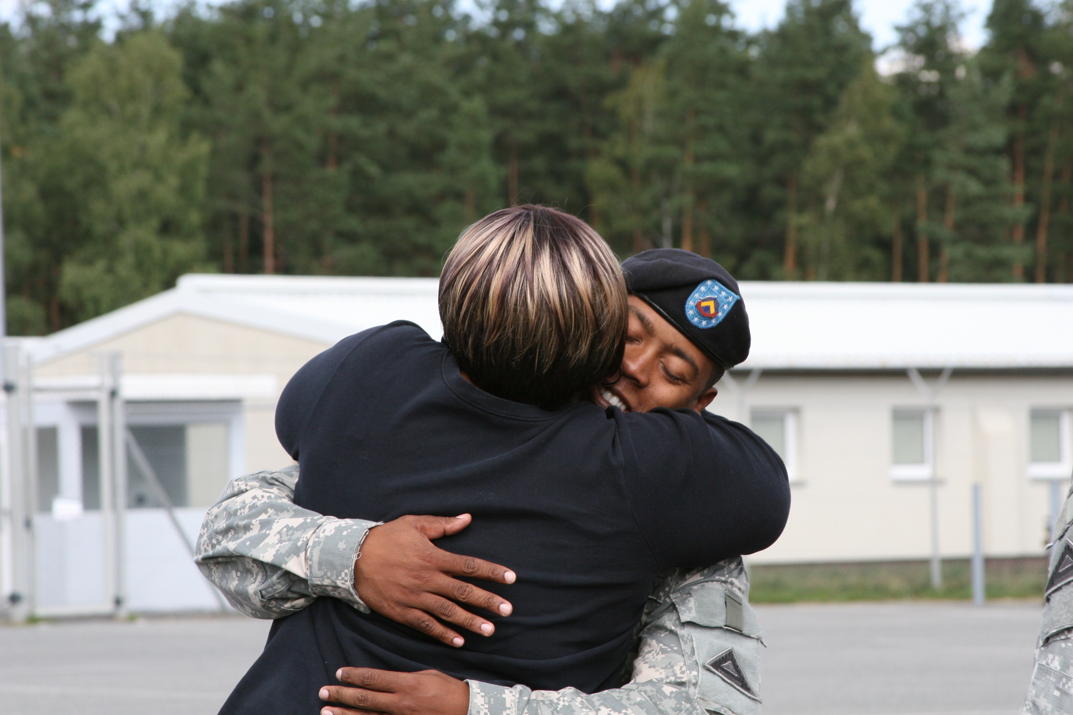 SGT Luis D. Quinones, an Information Technology technician at the Joint Multinational Simulation Center (JMSC) in Grafenwoehr, Germany, hugs his wife, Donetta, after receiving his promotion to sergeant during a ceremony at the JMSC last week. The JM...