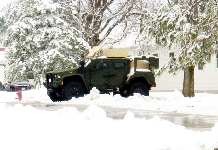 A military truck is used as part of training operations on the cantonment area after a spring snowstorm April 17, 2023, at Fort McCoy, Wis. Nearly 10 inches of snow fell on the installation