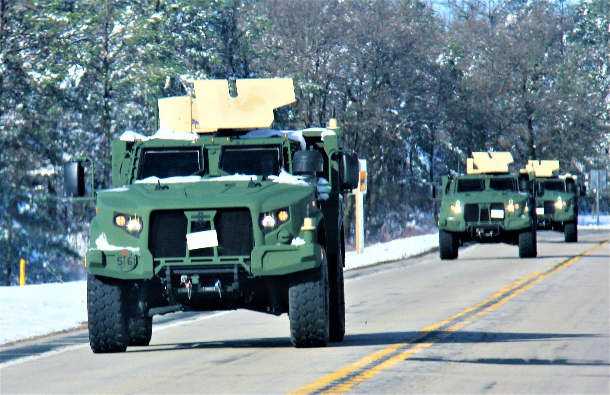 Personnel drive a Joint Light Tactical Vehicles (JLTVs) on Highway 21 on April 18, 2023, as part of training operations at Fort McCoy, Wis. The JLTV family of vehicles is designed to restore payload and performance that were traded from light tactical vehicles to add protection in recent conflict, according to the Army. JLTVs give service members more options in a protected mobility solution that is also the first vehicle purpose-built for modern battlefield networks. JLTV operator training at Fort McCoy began in May 2019. (U.S. Army Photo by Scott T. Sturkol, Public Affairs Office, Fort McCoy, Wis.)