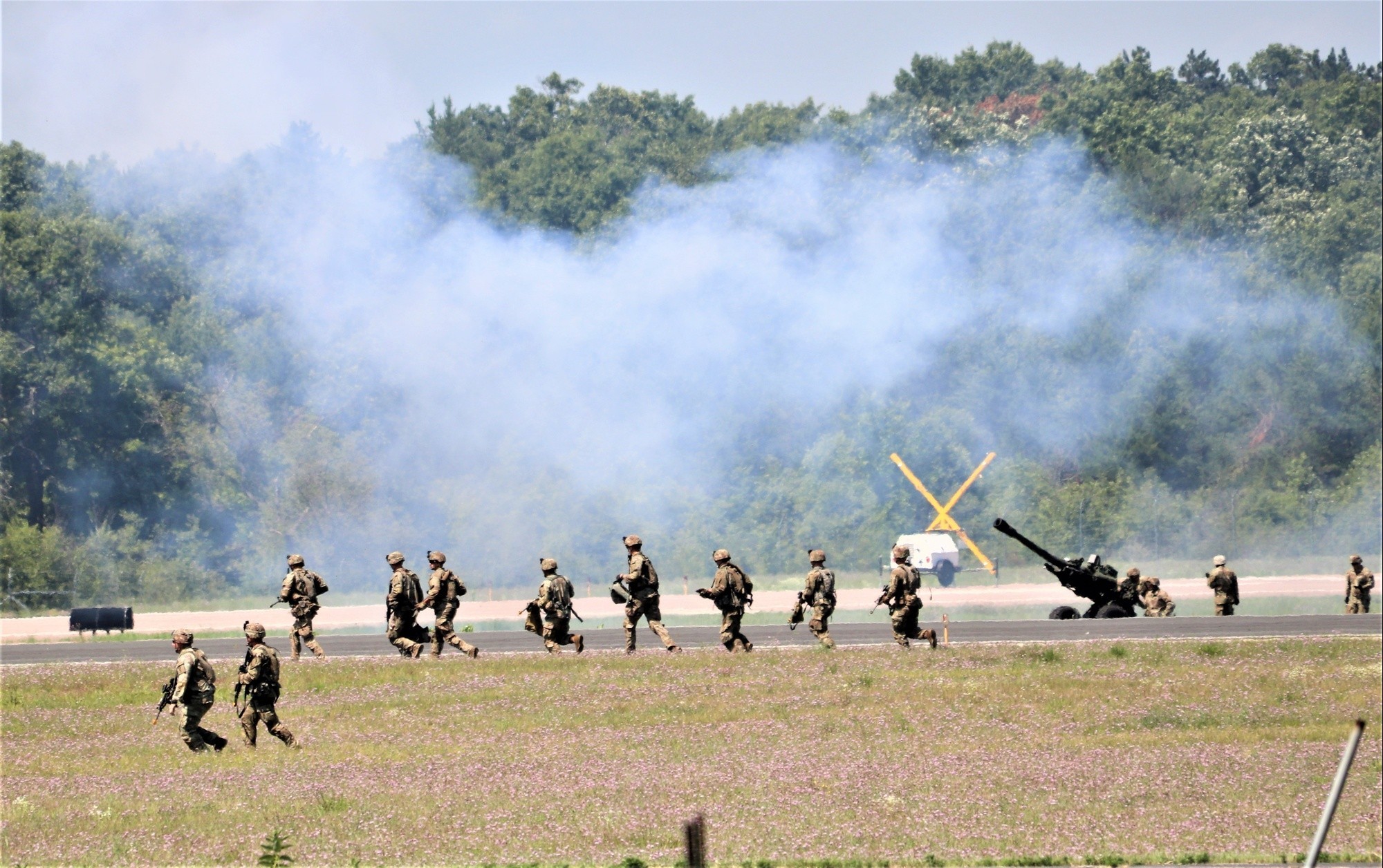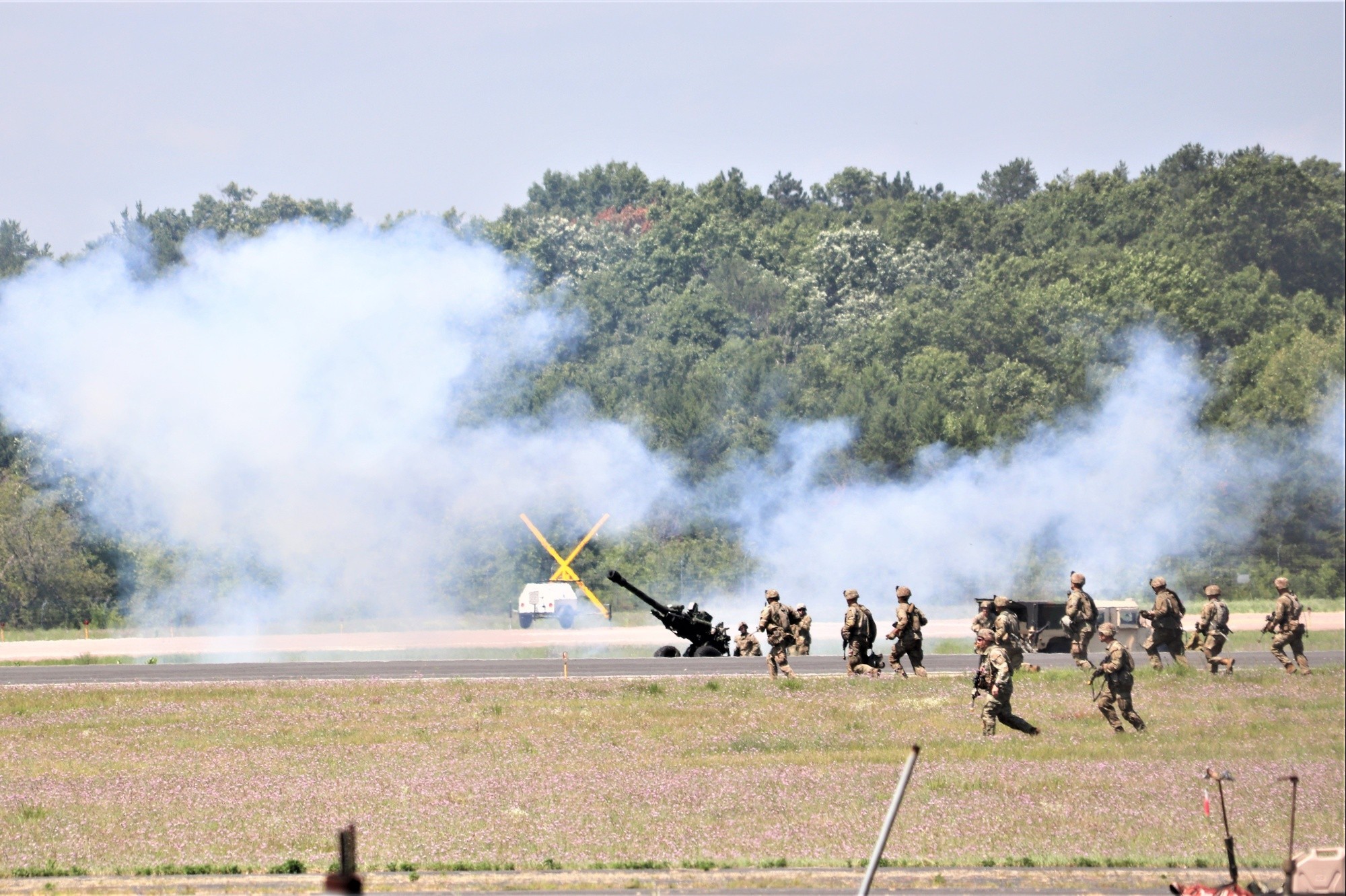 The event, which was a practice for the Experimental Aircraft Association’s AirVenture airshow in Oshkosh, Wis., included Soldiers and Airmen and included field artillery, UH-60 Black Hawk helicopters, an F-35A Lightning II, and a KC-135R Stratotanker.
