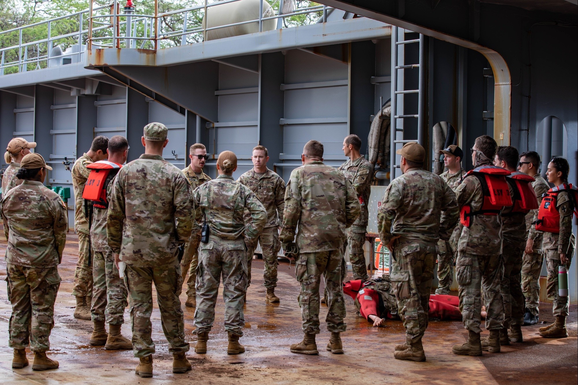 Army Mariners on Logistics Support Vessel 3, the General Brehon B. Somervell, and Soldiers with 545th Harbormaster Detachment, 8th Special Troops Battalion, 8th Theater Sustainment Command conduct a safety brief during overwater hoist operations with the 25th Combat Aviation Brigade, Jan. 23, 2024, in the waters off of Oahu, Hawaii. The two-day training cumulated with live personnel being retrieved from the water in an overboard scenario. (U.S. Army photo by Spc. Devin Davis)
