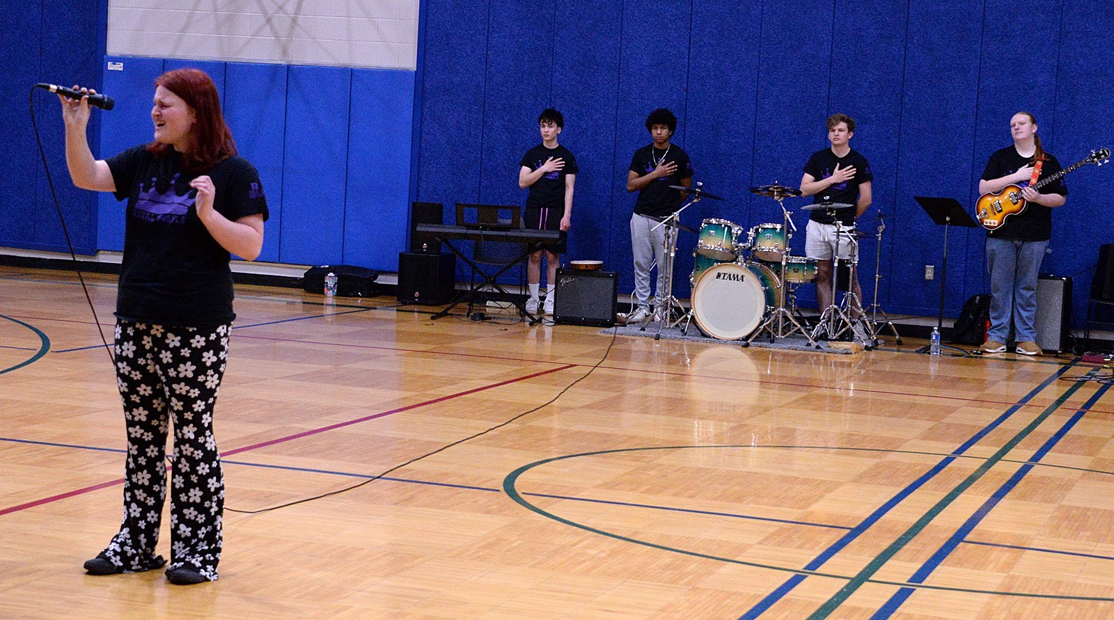 Royal Purple lead singer Alayna Parvin, Lansing High School graduate and freshman in music education at Baker University in Baldwin City, Kan., sings the national anthem as her bandmates Jonathan Duncan, junior at Lansing High School; Darien Richards, senior at Lansing High School; Clayton Anderson, senior at Lansing High School; and Liam Johnson, senior at Lansing High School, place their hands over their hearts during the Month of the Military Child kick-off assembly April 1, 2024, at Harrold Youth Center at Fort Leavenworth, Kan. Photo by Prudence Siebert/Fort Leavenworth Lamp