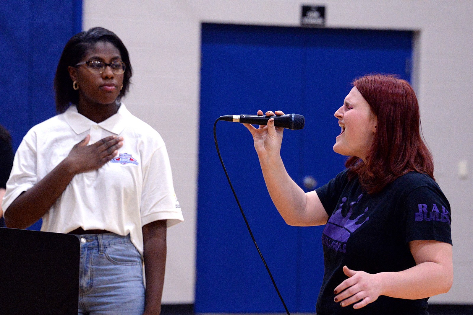 Fort Leavenworth, Kansas, Youth of the Year Rayna Klutse, senior at Leavenworth High School, places her hand over her heart as Alayna Parvin, freshman in music education at Baker University and lead singer for the Lansing, Kan.-based youth band Royal Purple, sings the national anthem during the Month of the Military Child kick-off assembly April 1 at Harrold Youth Center at Fort Leavenworth, Kan. Photo by Prudence Siebert/Fort Leavenworth Lamp