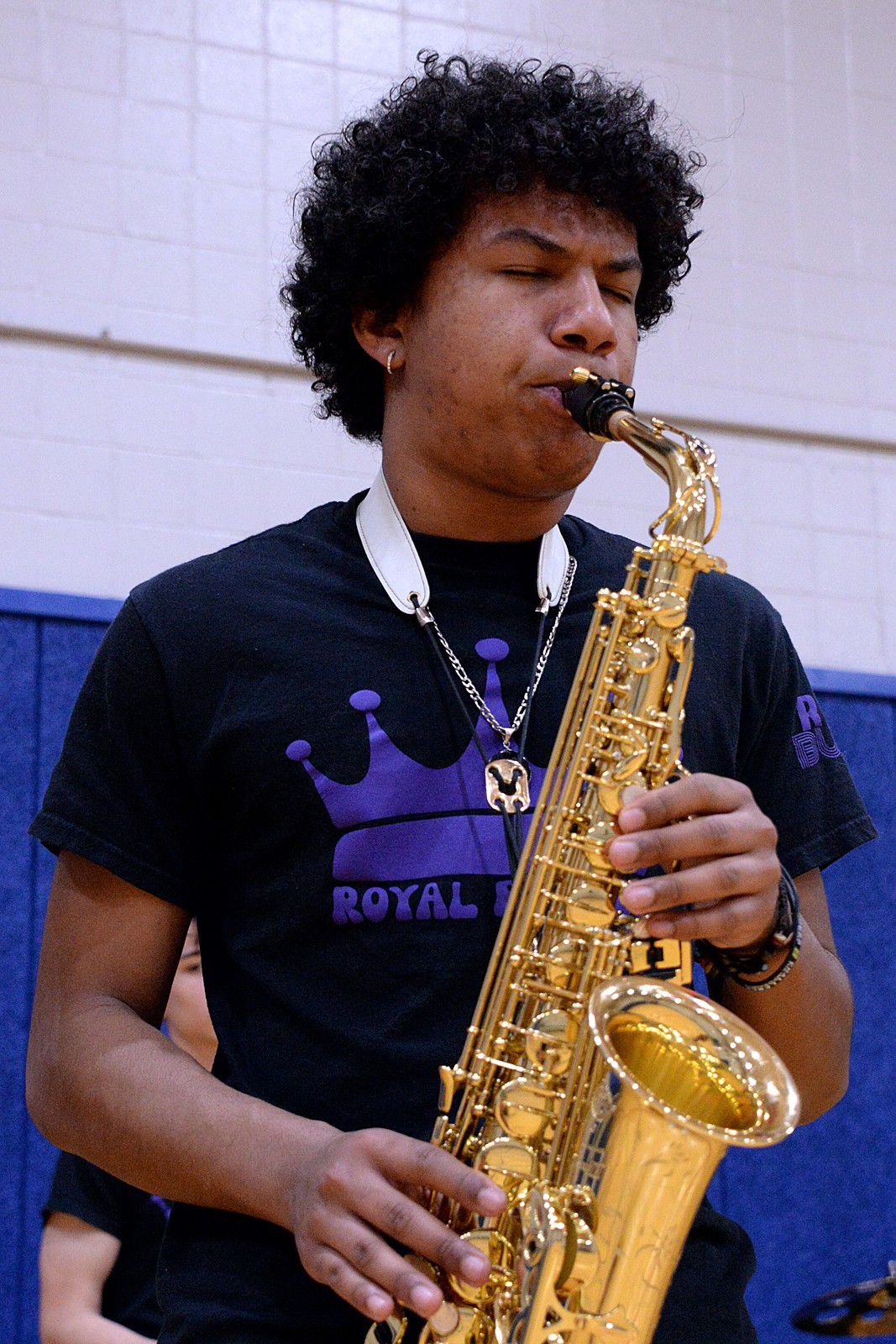 Royal Purple saxophone player Darien Richards, senior at Lansing High School, performs a solo during Stevie Wonder’s “Isn’t She Lovely” following the Month of the Military Child proclamation signing event April 1 at Harrold Youth Center at Fort Leavenworth, Kan. Photo by Prudence Siebert/Fort Leavenworth Lamp