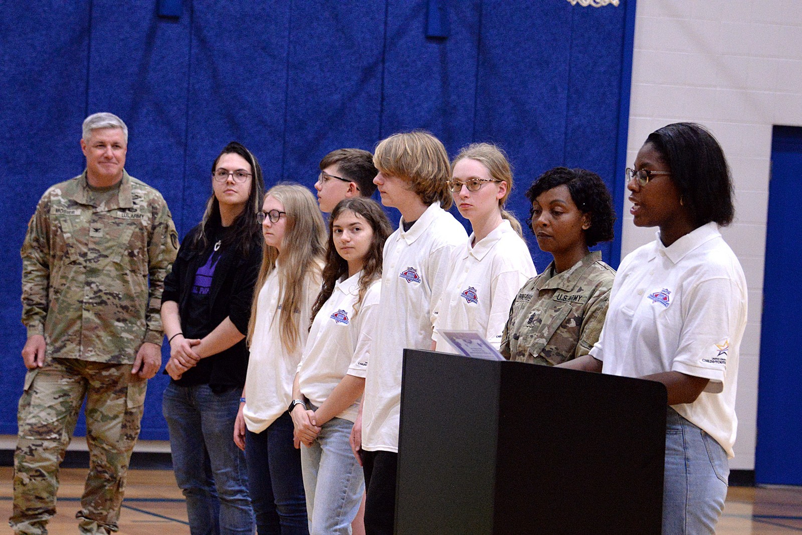 Fort Leavenworth, Kansas, Youth of the Year Rayna Klutse, right, senior at Leavenworth High School, reads the 2024 Month of the Military Child proclamation as Garrison Commander Col. Duane Mosier, Garrison Command Sgt. Maj. Erika Rhine-Russell and Klutse’s fellow Harrold Youth Center patrons Grayson Bennett, Beau Brown, Bella Brown, Alexis Hoffman, Skyler Johnson and Adrian Torres listen before signing their names to the proclamation during a MOMC kick-off assembly April 1 at Harrold Youth Center at Fort Leavenworth, Kan. Photo by Prudence Siebert/Fort Leavenworth Lamp