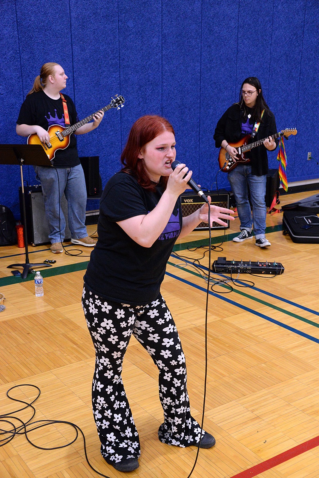 Royal Purple lead singer Alayna Parvin, Lansing (Kansas) High School graduate and freshman in music education at Baker University in Baldwin City, Kan., performs Britney Spears’ “Toxic” with bandmates bass player Liam Johnson, senior at Lansing High School, and guitar player Adrian Torres, senior at Lansing High School, after the Month of the Military Child kick-off assembly April 1, 2024, at Harrold Youth Center at Fort Leavenworth, Kan. Photo by Prudence Siebert/Fort Leavenworth Lamp