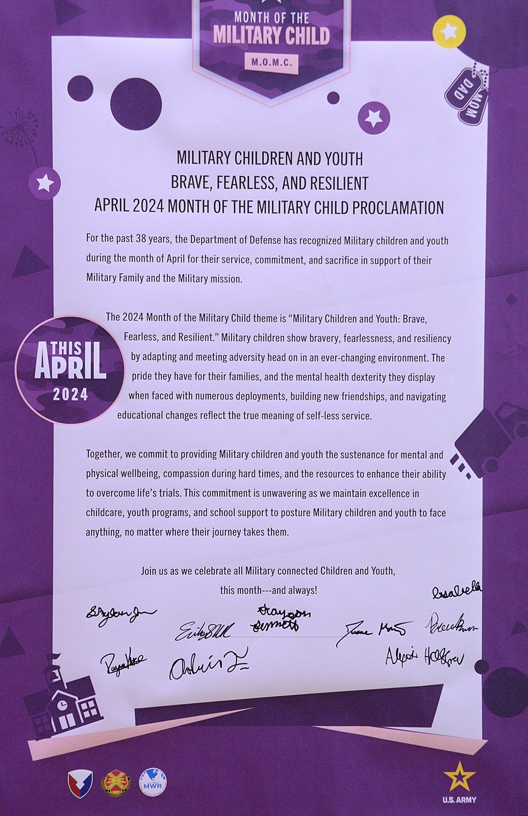 Hoffman said the proclamation will be displayed throughout the month of April at the various activities as a reminder of CYS’s and the community’s commitment to military children and youth.