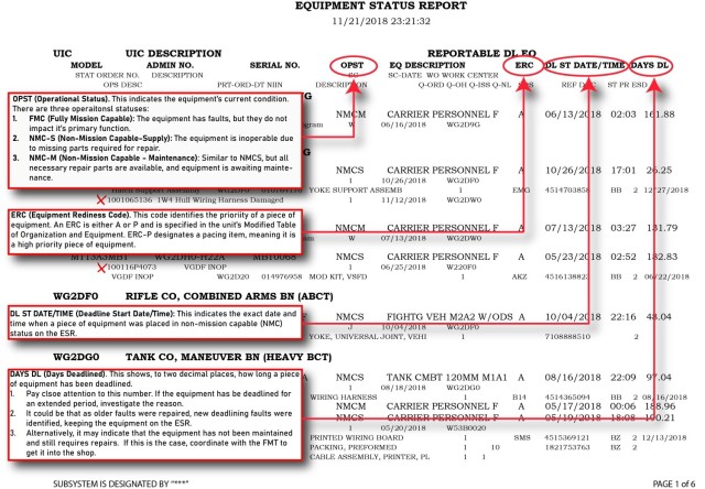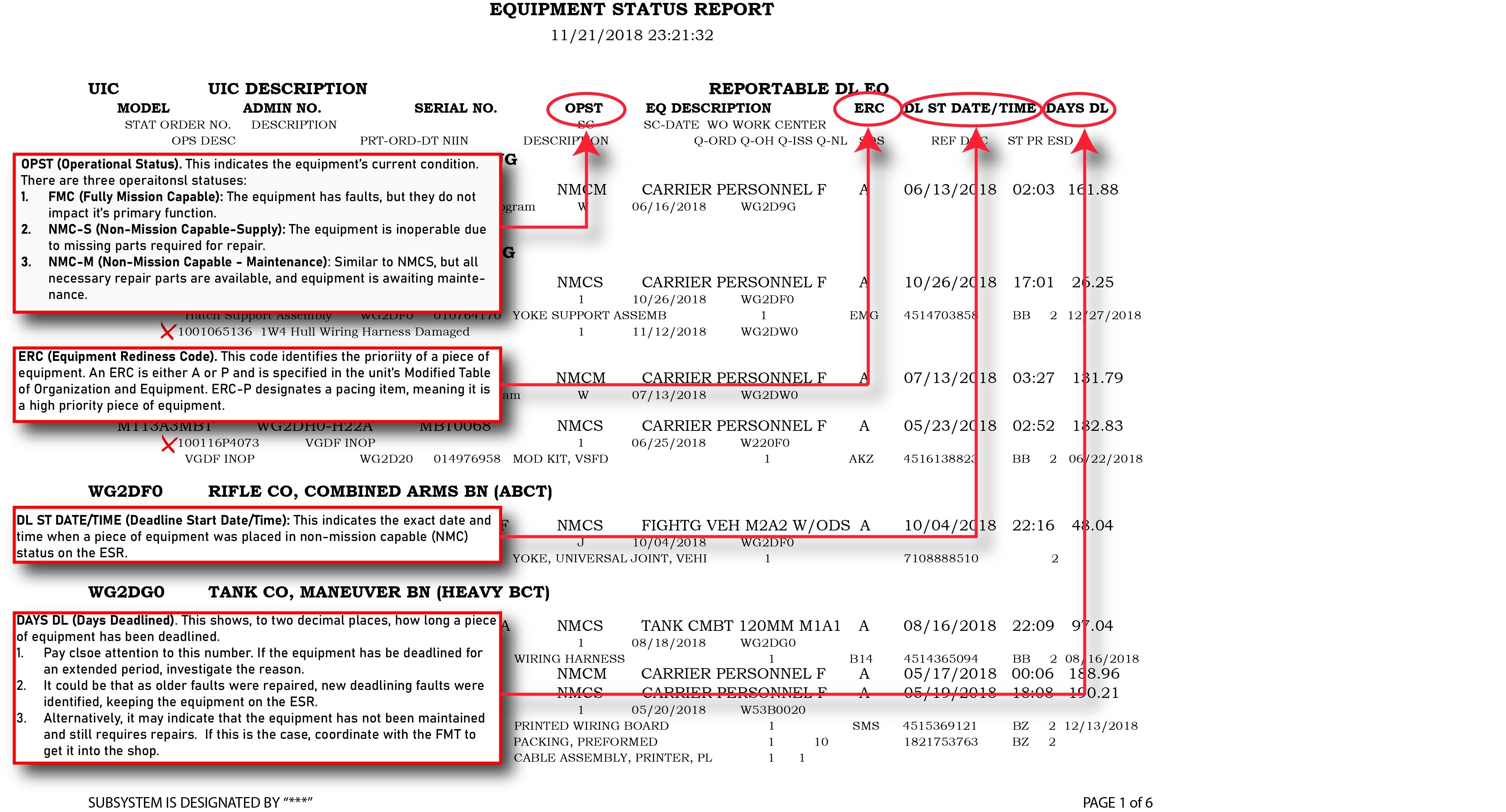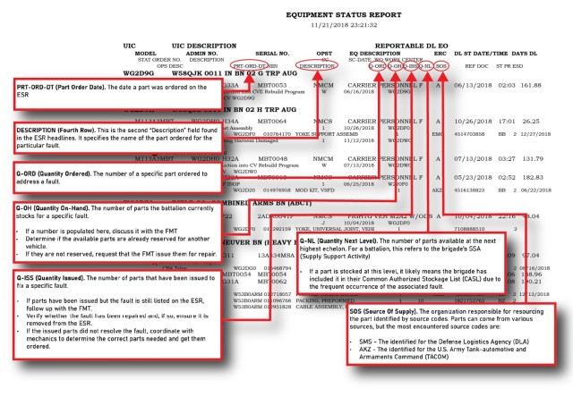 Of all the details on an ESR, there are a few that matter to platoon leaders the most. Their definitions, and how they can improve a maintenance program, are described in Figures 2 through Figure 5. The first four pieces of information are found in the second headlining row.