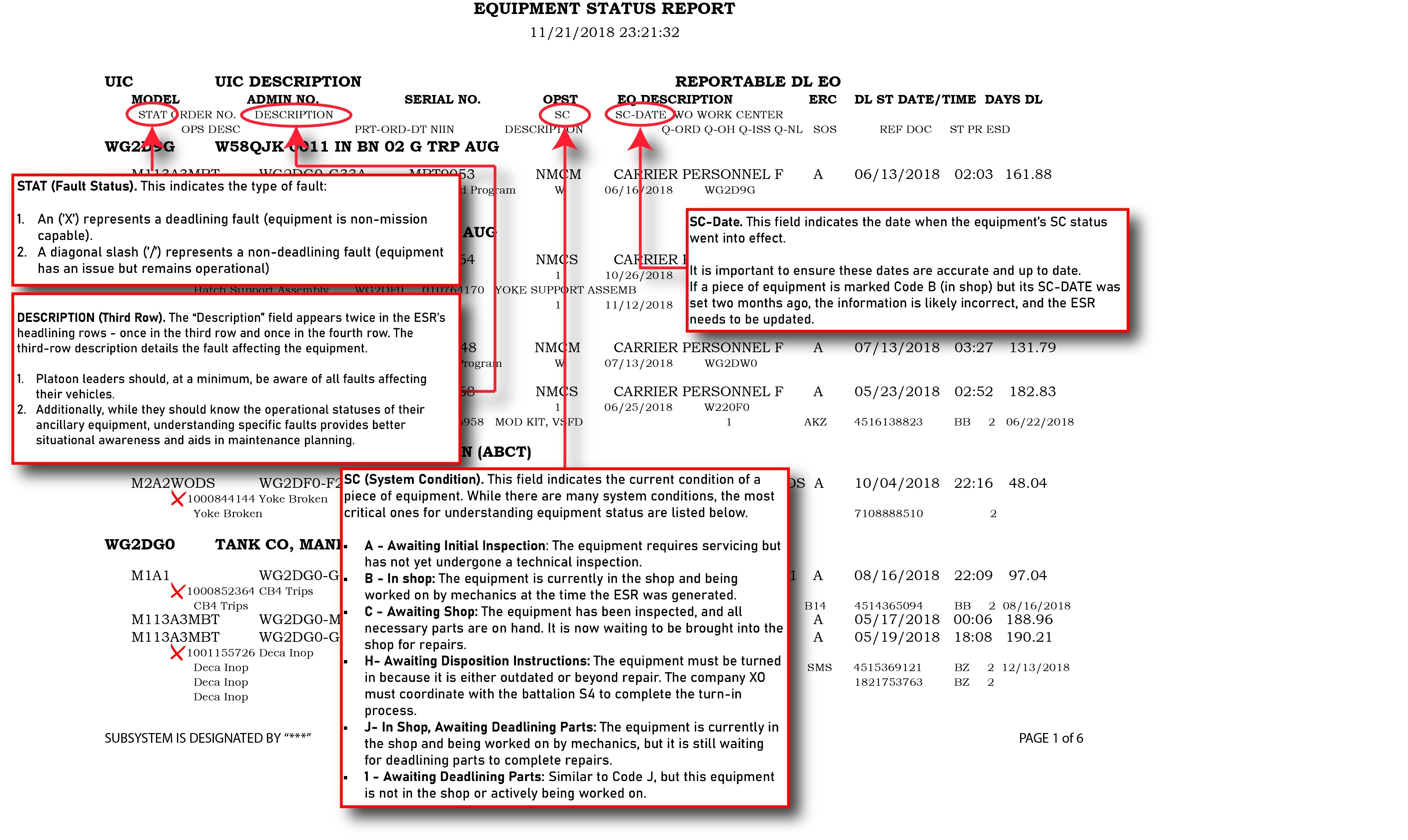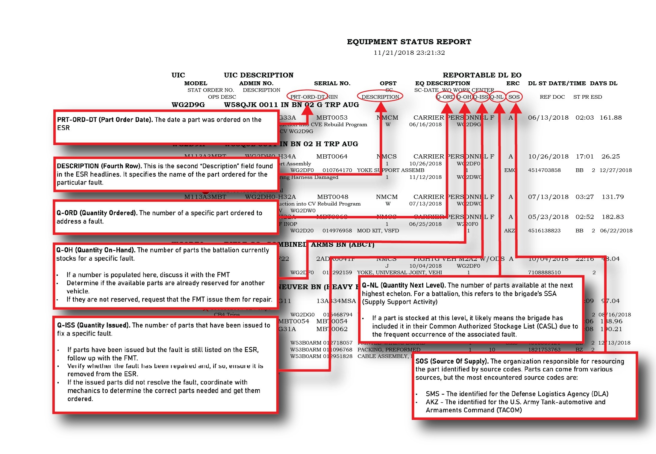 The first time looking at an ESR can be daunting—it may feel like a foreign language that platoon leaders are expected to understand immediately. However, once the headings on the ESR are understood and their corresponding information is recognized, reading it becomes much easier. The purpose of the ESR is to provide a clear picture of the status of a unit’s equipment. If there is an issue with a piece of equipment, it must be reflected on the ESR. Additionally, a fault must be listed on the ESR to order a part for it. The ESR serves as an essential system of record, enabling a platoon leader to hold themselves and their battalion’s maintenance enterprise accountable.