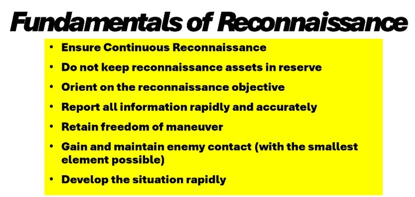 According to FM 3-98 “reconnaissance is a mission to obtain, by visual observation or other detection methods, information about the activities and resources of an enemy or adversary, or to secure data concerning the… characteristics of a particular area.” Whether pushing, pulling, mounted, dismounted, conducting aerial, or recon by fire reconnaissance, the fundamentals of reconnaissance have guided the basic employment of forces to obtain information critical to mission success.