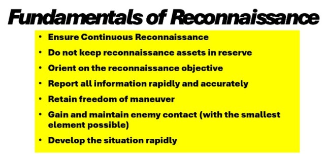 Crucial to employment of these fundamentals is the basic elements of command reconnaissance guidance. Commanders – at a minimum – must articulate reconnaissance focus, tempo of reconnaissance, engagement/disengagement criteria, and displacement criteria to drive reconnaissance success.