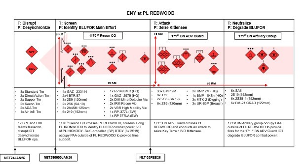 These tools should drive effective information collection planning as units exit mission analysis and continue towards course of action development. The information collection synchronization matrix (ICSM) is the key warfighting product that synchronizes collection assets in time and space against both priority and target intelligence requirements and should be a key output of mission analysis. But too often the ICSM does not account for the limitations of new forms of reconnaissance and security. For example, ICSMs consistently reflect medium and long range reconnaissance unmanned aerial system (UAS) as 24/7 all-weather sensors. All systems observed at JMRC have limitations dictated by the complex terrain and often punishing weather conditions that inhibit advertised performance. For example, temperatures dropping below zero reduced the battery performance to less than 67% of the Motorized Rifle Regiment (MRR) platform’s advertised capability during rotations in the winter. Finally, operator fatigue, coupled with rest and security plan requirements, prevents units from executing their planned collection. In lieu of 24/7, all-weather assets, the brigade information collection (IC) manager must completely understand asset capabilities and deliberately schedule their use over named areas of interest (NAIs) to meet the priority intelligence requirements.