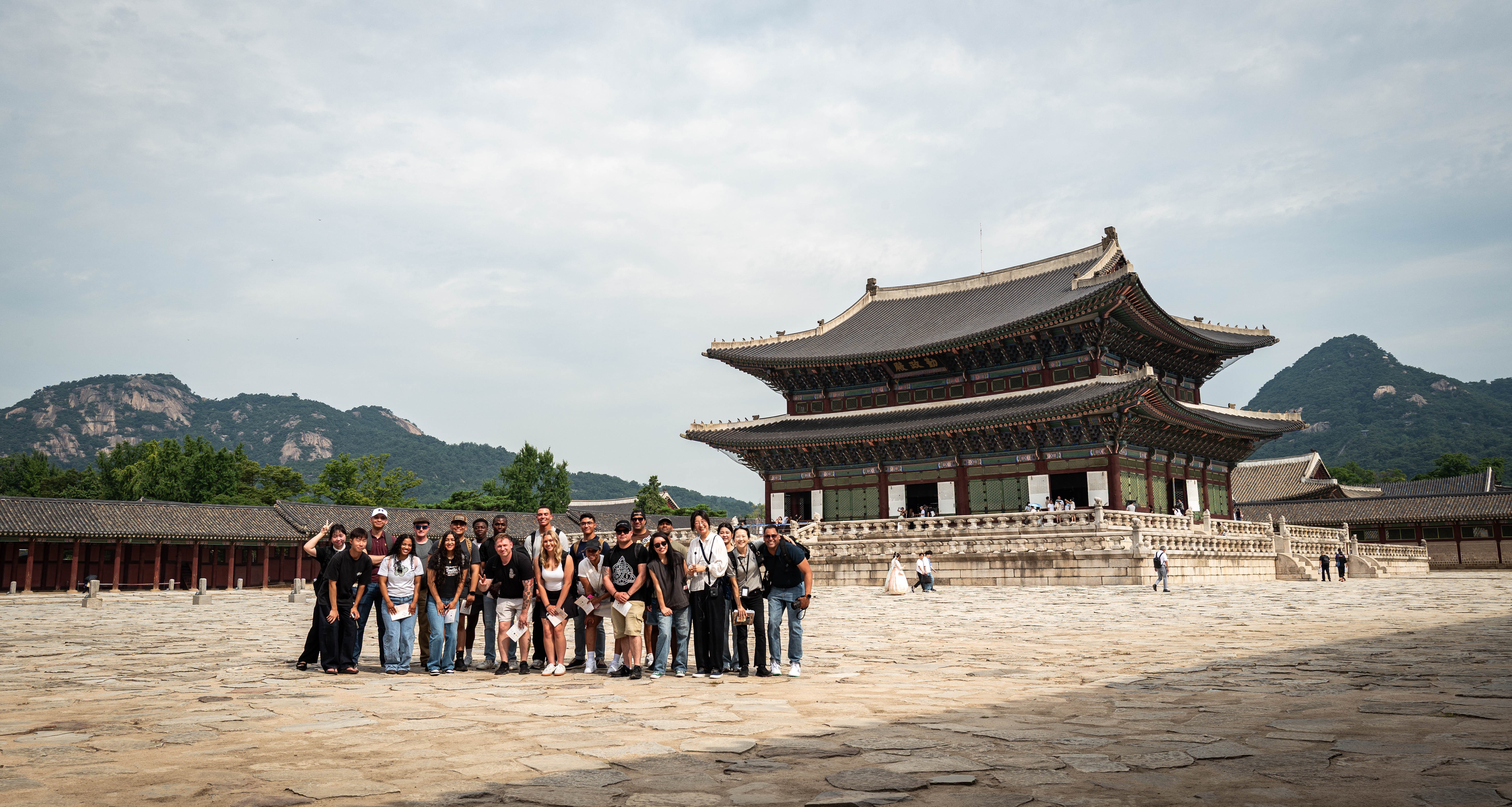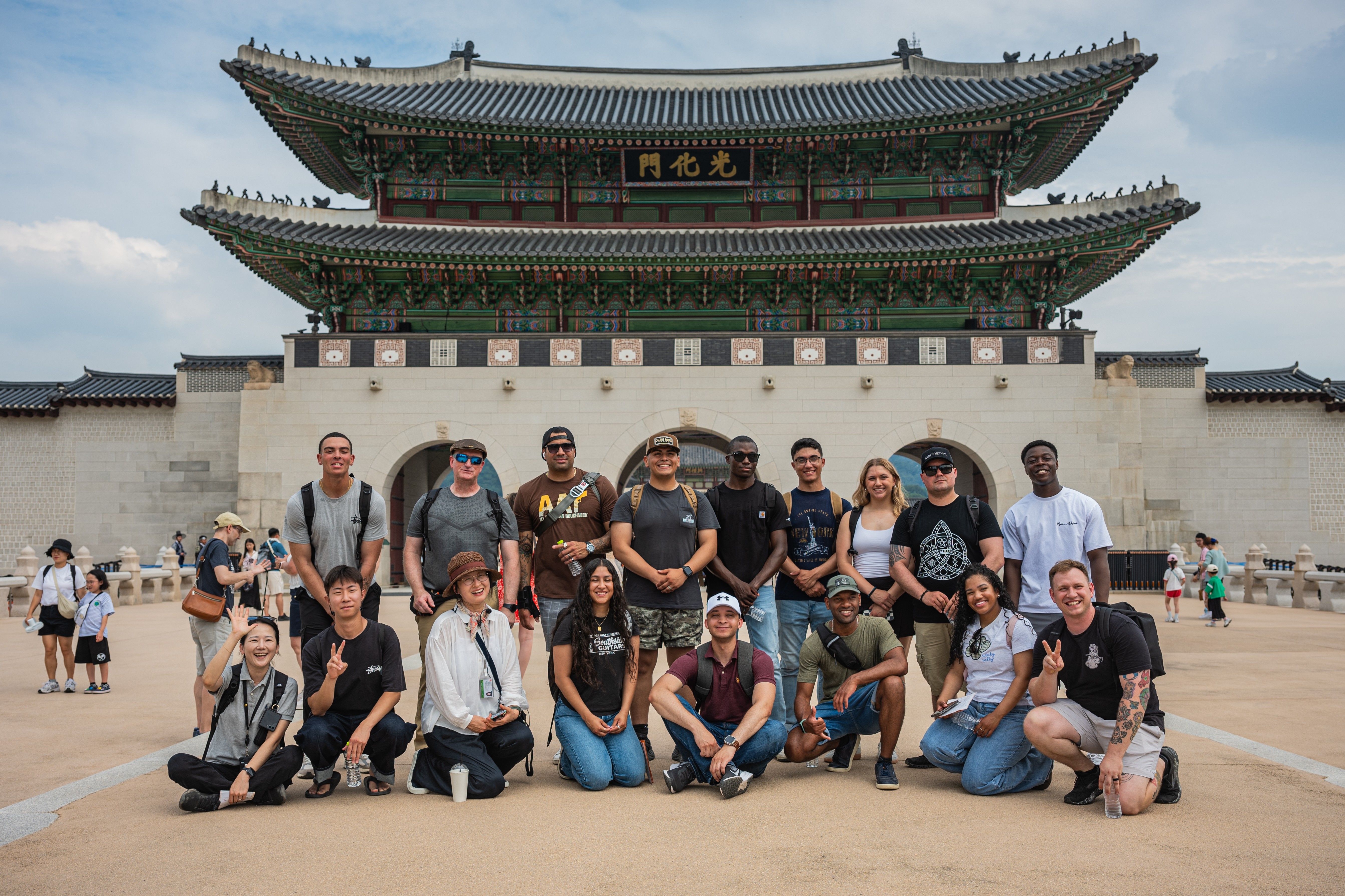 U.S. Army Soldiers pose for a photograph on the grounds at Gyeongbokgung Palace in Seoul, Korea, July 31, 2025. Soldiers serving at Camp Casey traveled to Seoul on a trip hosted by Gyeonggi-Do province as part of an effort to welcome service-members who have recently arrived in Korea. (U.S. Army photo by Sgt. Charles Leitner)