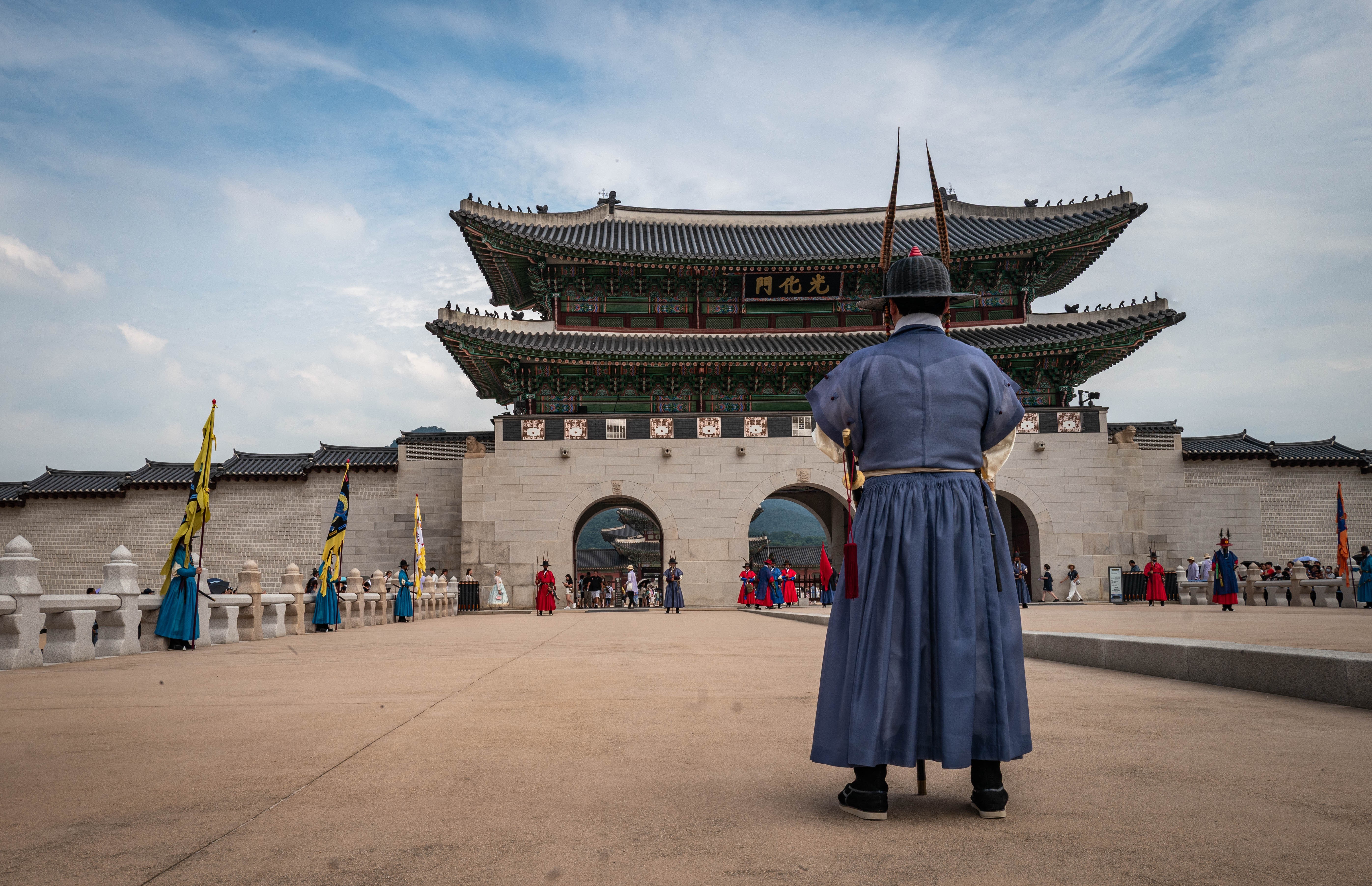 A Royal Guard stands to post at Gyeongbokgung Palace in Seoul, Korea, July 31, 2025. U.S. Army Soldiers serving at Camp Casey traveled to Seoul on a trip hosted by Gyeonggi-Do province as part of an effort to welcome service-members who have recently arrived in Korea. (U.S. Army photo by Sgt. Charles Leitner)
