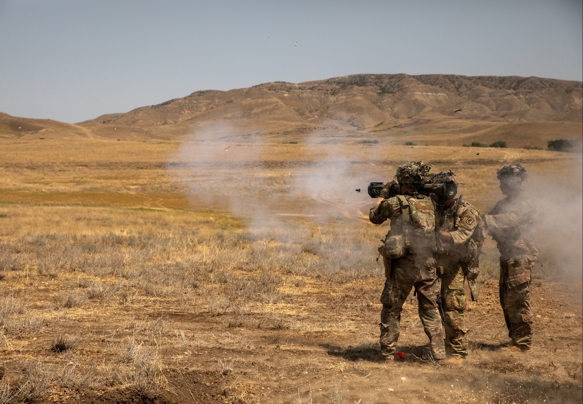 U.S. Army Soldiers with 1st Squadron, 91st Cavalry Regiment, 173rd Airborne Brigade, destroy an enemy building with a Carl Gustav 84mm recoilless rifle during a live fire training exercise at Vaziani Training Area, Georgia, Aug. 3, 2025, during Agile Spirit. Agile Spirit 25 underscores the U.S. commitment to security and stability in the Black Sea region and highlights the importance of strong alliances and partnerships in addressing shared security challenges.