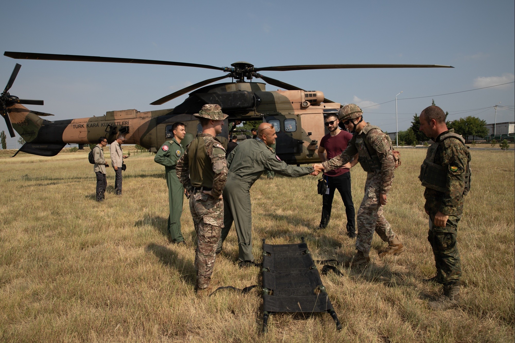 Service members with the 22nd Multinational Battalion review casualty handling procedures with Turkish aircrew members during a medevac training mission at Vaziani Training Area, Aug. 2, 2025, during exercise Agile Spirit. Agile Spirit 25 underscores the U.S. commitment to security and stability in the Black Sea region and highlights the importance of strong alliances and partnerships in addressing shared security challenges.
