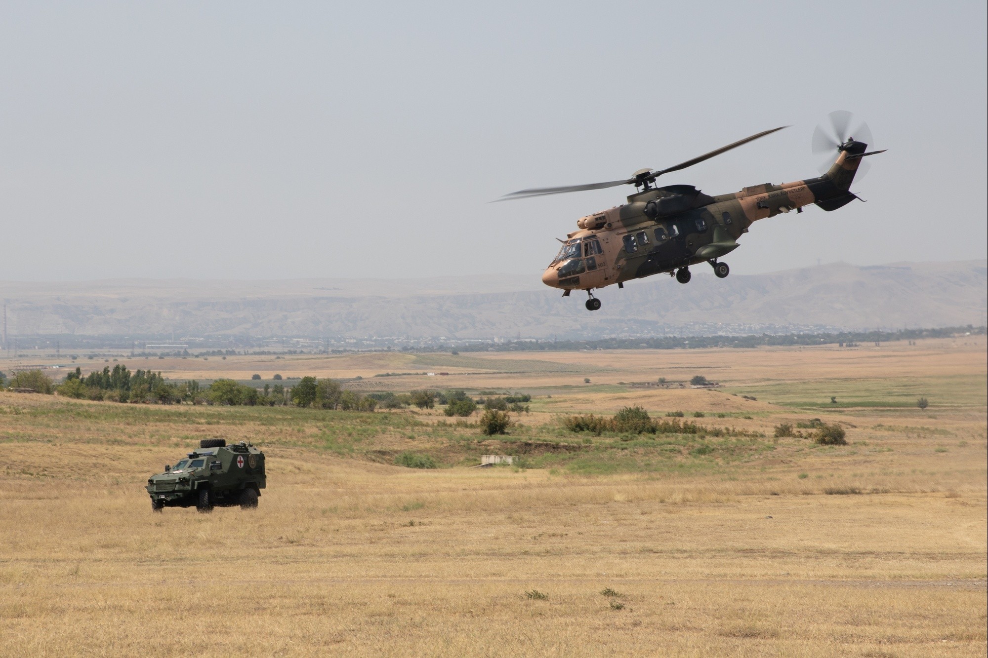 A Turkish AS532 Cougar helicopter takes off with a simulated casualty at Vaziani Training Area, Vaziani, Georgia, Aug. 3, 2025. Agile Spirit 25 underscores the U.S. commitment to security and stability in the Black Sea region and highlights the importance of strong alliances and partnerships in addressing shared security challenges.