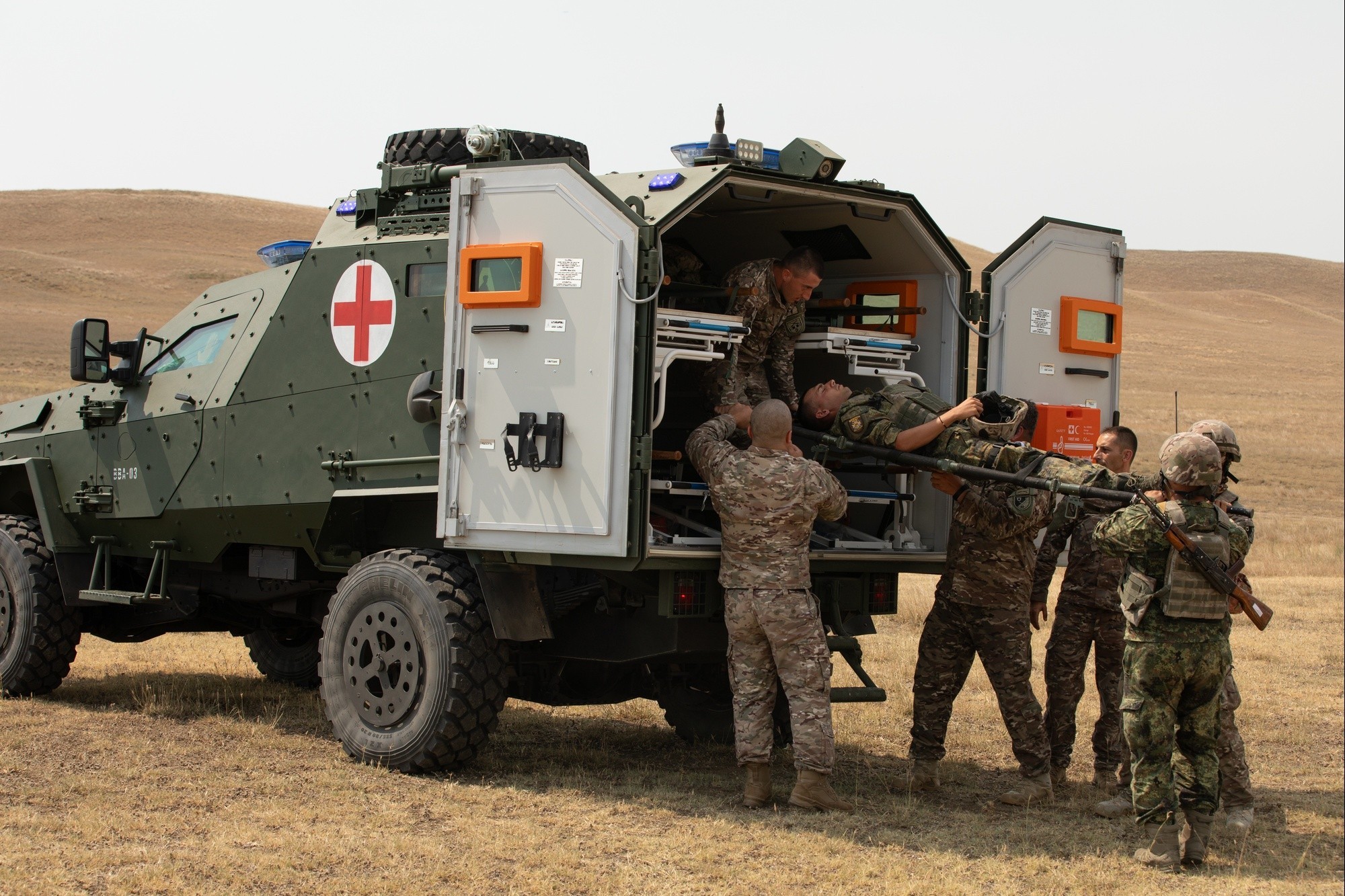 Service members from the 22nd Multinational Battalion transport a simulated casualty from a Georgian armored ambulance for onward care during a medevac training mission at Vaziani Training Area, Georgia, Aug. 2, 2025, during Agile Spirit 25. Agile Spirit 25 underscores the U.S. commitment to security and stability in the Black Sea region and highlights the importance of strong alliances and partnerships in addressing shared security challenges.