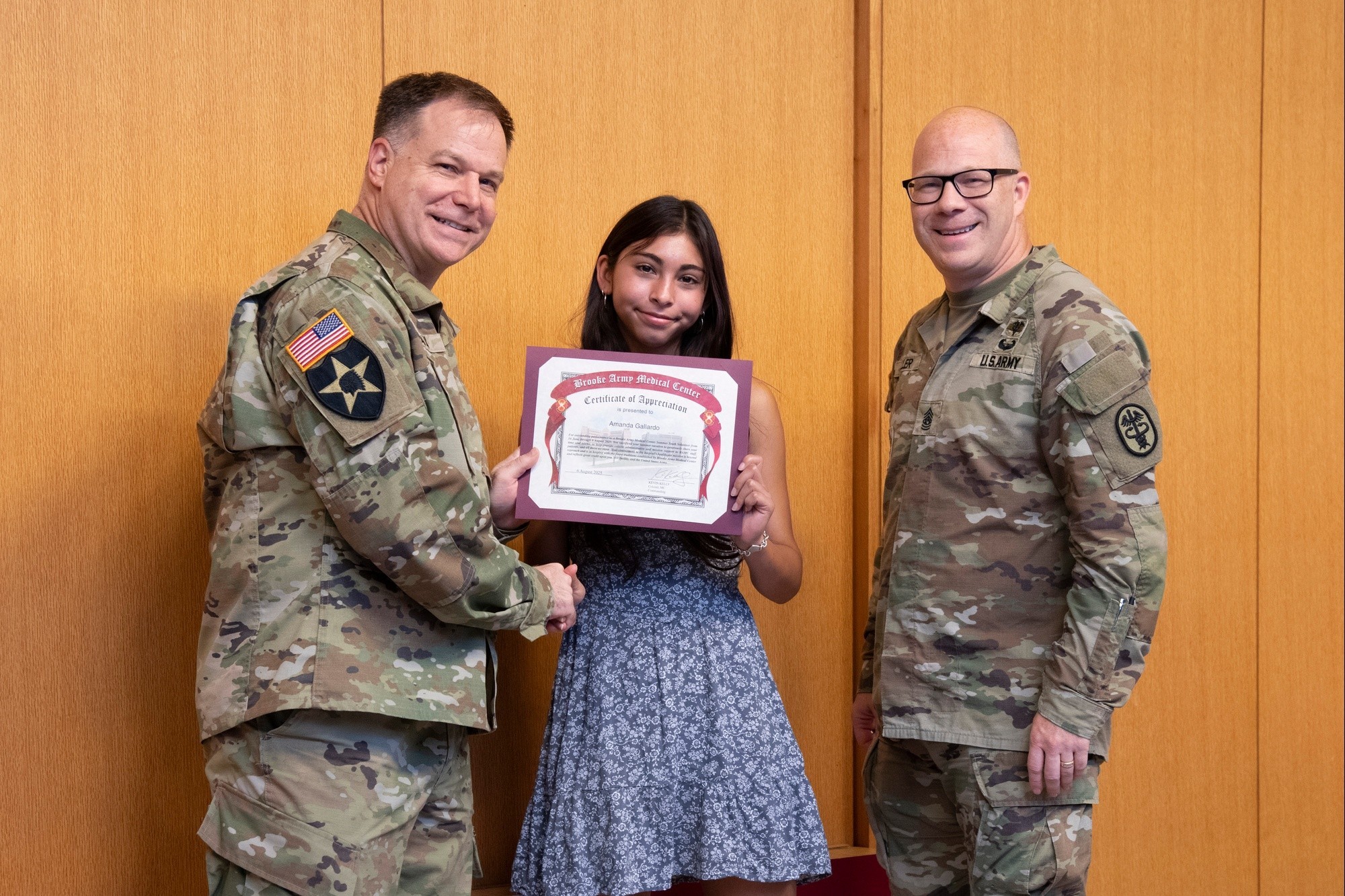 Brooke Army Medical Center Commander Col. Kevin Kelly and Command Sgt. Maj. Jan “Eddy” Miller, present a certificate of appreciation to youth volunteer Amanda Gallardo during a ceremony in BAMC’s Carolyn D. Putnam Auditorium at Joint Base San Antonio – Fort Sam Houston, Aug. 6, 2025. Each year the BAMC Summer Youth Program gives youth between the ages 14-18 the opportunity to volunteer in different areas throughout the organization to gain new skills and learn about military healthcare. (DoD photo by Jason W. Edwards)