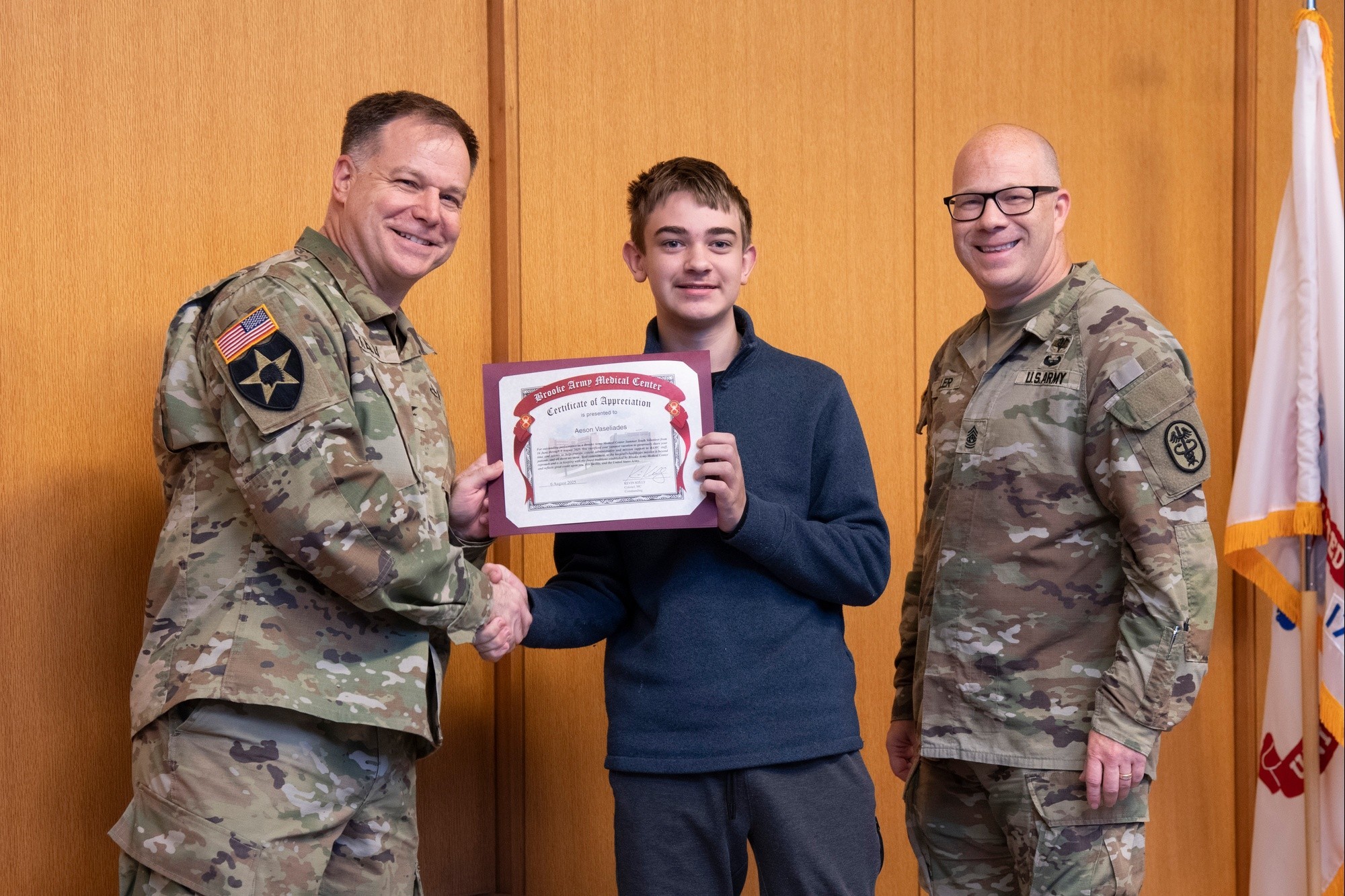 Brooke Army Medical Center Commander Col. Kevin Kelly and Command Sgt. Maj. Jan “Eddy” Miller, present a certificate of appreciation to youth volunteer Matthew Adams during a ceremony in BAMC’s Carolyn D. Putnam Auditorium at Joint Base San Antonio – Fort Sam Houston, Aug. 6, 2025. Each year the BAMC Summer Youth Program gives youth between the ages 14-18 the opportunity to volunteer in different areas throughout the organization to gain new skills and learn about military healthcare. (DoD photo by Jason W. Edwards)