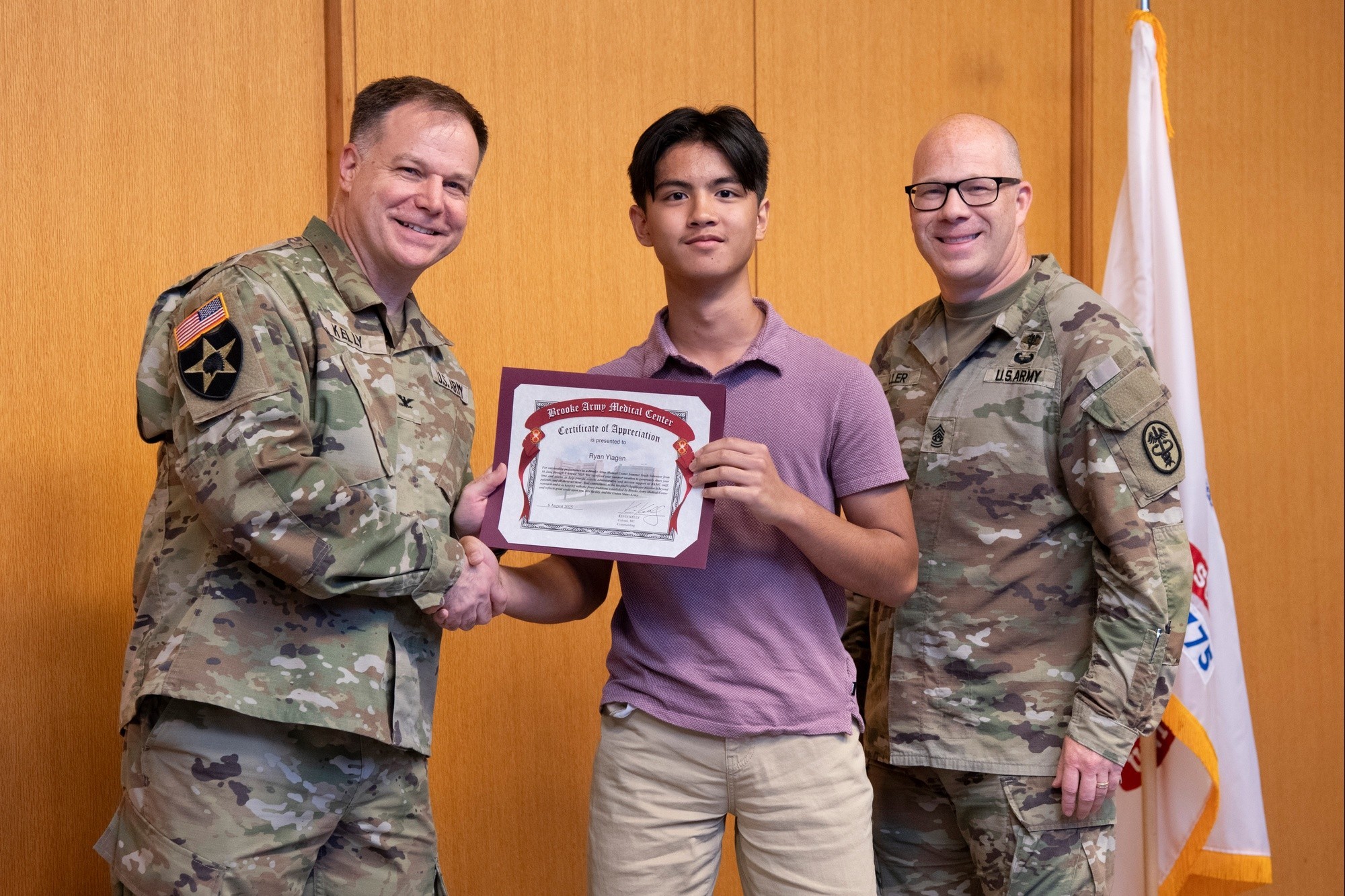 Brooke Army Medical Center Commander Col. Kevin Kelly and Command Sgt. Maj. Jan “Eddy” Miller, present a certificate of appreciation to youth volunteer Ryan Ylagan during a ceremony in BAMC’s Carolyn D. Putnam Auditorium at Joint Base San Antonio – Fort Sam Houston, Aug. 6, 2025. Each year the BAMC Summer Youth Program gives youth between the ages 14-18 the opportunity to volunteer in different areas throughout the organization to gain new skills and learn about military healthcare. (DoD photo by Jason W. Edwards)