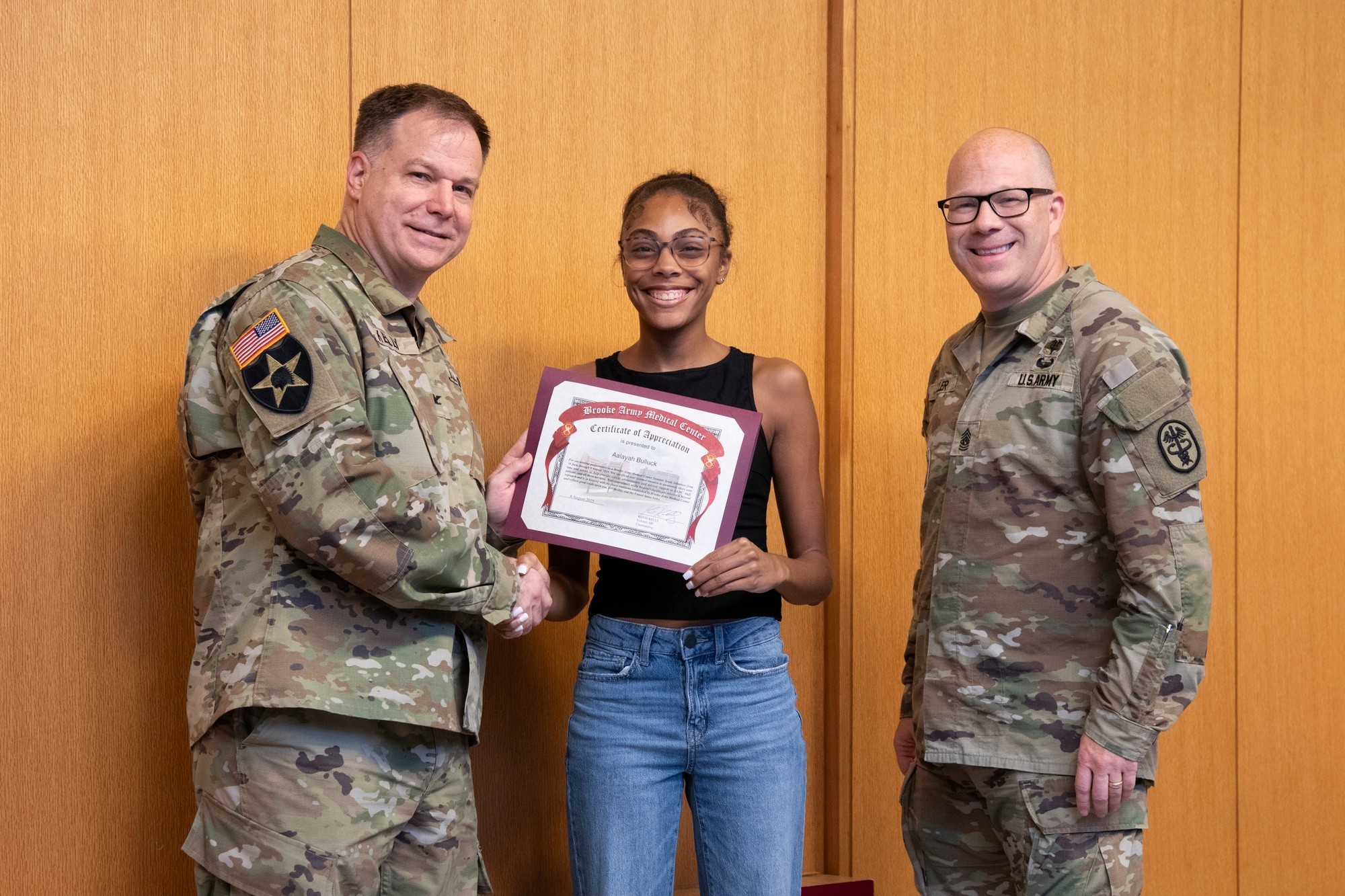 Brooke Army Medical Center Commander Col. Kevin Kelly and Command Sgt. Maj. Jan “Eddy” Miller, present a certificate of appreciation to youth volunteer Katelyn Adams during a ceremony in BAMC’s Carolyn D. Putnam Auditorium at Joint Base San Antonio – Fort Sam Houston, Aug. 6, 2025. Each year the BAMC Summer Youth Program gives youth between the ages 14-18 the opportunity to volunteer in different areas throughout the organization to gain new skills and learn about military healthcare. (DoD photo by Jason W. Edwards)