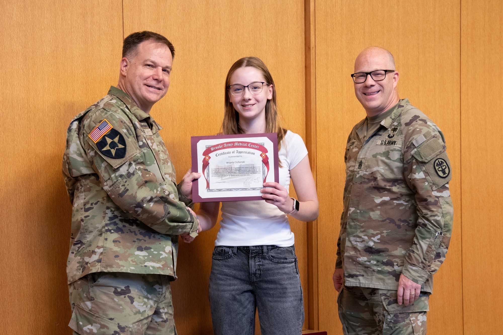 Brooke Army Medical Center Commander Col. Kevin Kelly and Command Sgt. Maj. Jan “Eddy” Miller, present a certificate of appreciation to youth volunteer Isabel Krumbholz during a ceremony in BAMC’s Carolyn D. Putnam Auditorium at Joint Base San Antonio – Fort Sam Houston, Aug. 6, 2025. Each year the BAMC Summer Youth Program gives youth between the ages 14-18 the opportunity to volunteer in different areas throughout the organization to gain new skills and learn about military healthcare. (DoD photo by Jason W. Edwards)