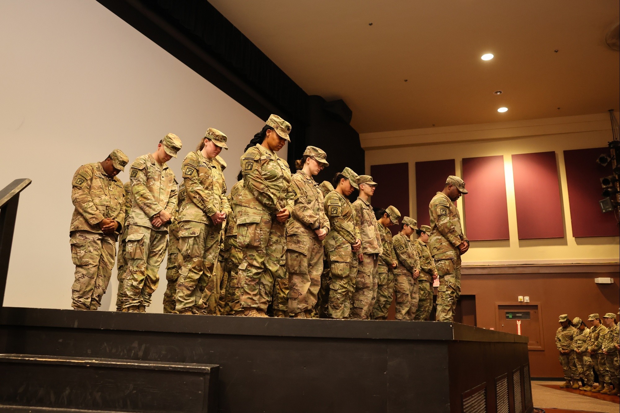 Family members and friends packed the theater, waving signs and snapping photos as the Soldiers marched in, greeted by a standing ovation.
